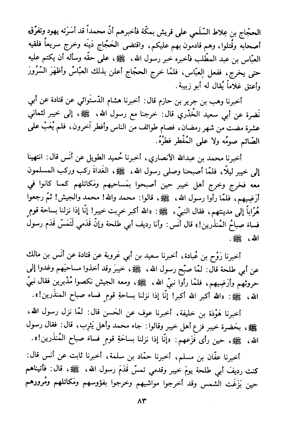 أَخْبَرَنَا مُحَمَّدُ بْنُ عَبْدِ اللَّهِ الأَنْصَارِيُّ. أَخْبَرَنَا حُمَيْدٌ الطَّوِيلُ عَنْ أَنَسٍ قَالَ: انْتَهَيْنَا إِلَى خَيْبَرَ لَيْلا. فَلَمَّا أَصْبَحْنَا وَصَلَّى رَسُولُ اللَّهِ - صَلَّى اللَّهُ عَلَيْهِ وَسَلَّمَ - الْغَدَاةَ رَكِبَ وَرَكِبَ الْمُسْلِمُونَ مَعَهُ فَخَرَجَ وَخَرَجَ أَهْلُ خَيْبَرَ حِينَ أَصْبَحُوا بِمَسَاحِيهِمْ وَمَكَاتِلِهِمْ كَمَا كَانُوا فِي أَرَضِيهِمْ. فَلَمَّا رَأَوْا رَسُولَ اللَّهِ - صَلَّى اللَّهُ عَلَيْهِ وَسَلَّمَ - قَالُوا: مُحَمَّدٌ وَاللَّهِ! مُحَمَّدٌ وَالْجَيْشُ! ثُمَّ رَجَعُوا هِرَابَا إِلَى مَدِينَتِهِمْ. [فَقَالَ النبي. ص: الله أكبر خربت خيبر! إنا إذا نزلنا بِسَاحَةِ قَوْمٍ فَساءَ صَباحُ الْمُنْذَرِينَ!] قَالَ أَنَسٌ: وَأَنَا رَدِيفُ أَبِي طَلْحَةَ وَإِنَّ قَدَمَيَّ لَتَمَسُّ قَدِمَ رَسُولُ اللَّهِ - صَلَّى اللَّهُ عَلَيْهِ وَسَلَّمَ -