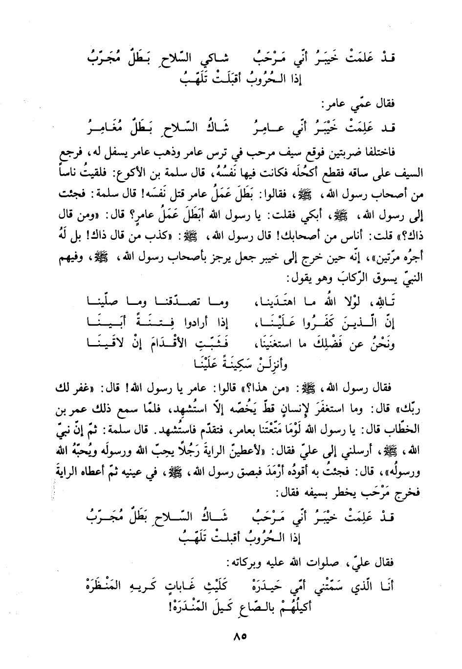 [فقال رسول الله. ص: مَنْ هَذَا؟ قَالُوا: عَامِرٌ يَا رَسُولَ اللَّهِ! قَالَ: غَفَرَ لَكَ رَبُّكَ] قَالَ: وَمَا اسْتَغْفَرَ لإِنْسَانٍ قَطُّ يَخُصُّهُ إِلا اسْتُشْهِدَ. فَلَمَّا سَمِعَ ذَلِكَ عُمَرُ بْنُ الْخَطَّابِ قَالَ: يَا رَسُولَ الله لو ما مَتَّعْتَنَا بِعَامِرٍ. فَتَقَدَّمَ فَاسْتُشْهِدَ. قَالَ سَلَمَةُ: ثُمَّ أَنَّ نَبِيَّ اللَّهِ - صَلَّى اللَّهُ عَلَيْهِ وَسَلَّمَ - أرسلني إلى علي [فقال: لأعطين الراية رَجُلا يُحِبُّ اللَّهَ وَرَسُولَهُ وَيُحِبُّهُ اللَّهُ وَرَسُولُهُ] . قَالَ: فَجِئْتُ بِهِ أَقُودُهُ أَرْمَدَ فَبَصَقَ رَسُولُ اللَّهِ - صَلَّى اللَّهُ عَلَيْهِ وَسَلَّمَ - فِي عَيْنَيْهِ ثُمَّ أَعْطَاهُ الرَّايَةَ فَخَرَجَ مَرْحَبٌ يَخْطِرُ بِسَيْفِهِ فَقَالَ: