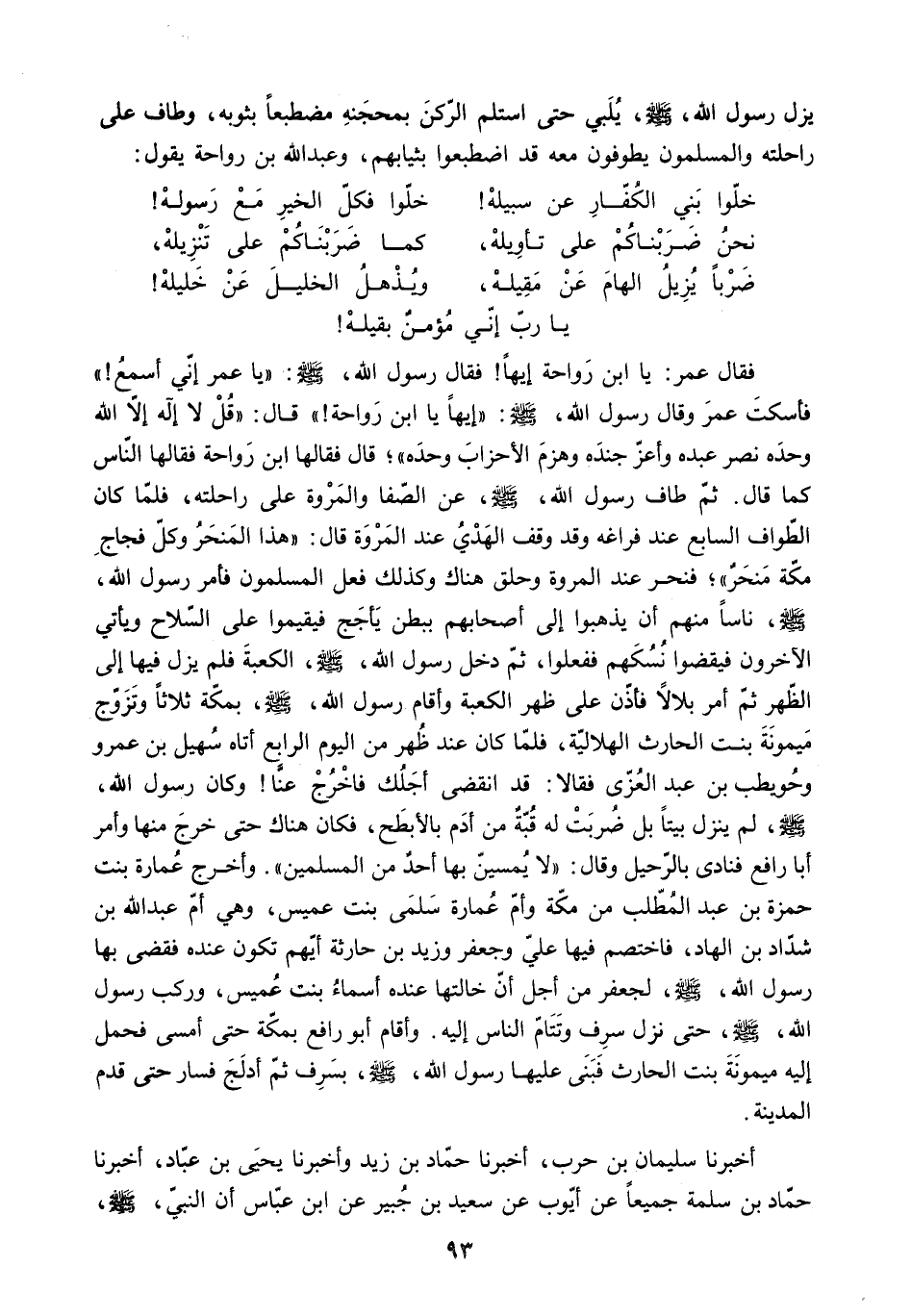 [فَقَالَ عُمَر: يا ابن رواحة إيها! فَقَالَ رَسُول الله. ص: يا عُمَر إني أسمع! فأسكت عُمَر وَقَالَ رسول الله. ص: إيهًا يا ابن رواحة! قَالَ: قل لا إله إلا اللَّه وحده نصر عبده وأعز جنده وهزم الأحزاب وحده] . قَالَ فقالها ابن رواحة فقالها النّاس كما قَالَ. ثُمَّ طَافَ رَسُولُ اللَّهِ - صَلَّى اللَّهُ عَلَيْهِ وَسَلَّمَ - عَنْ الصفا والمروة عَلَى راحلته. فلما كَانَ الطواف السابع عند فراغه وقد وقف الهدي عند المروة [قَالَ: هذا المنحر وكل فجاج مكّة منحر] . فنحر عند المروة وحلق هناك وكذلك فعل المسلمون فأمر رسول الله.