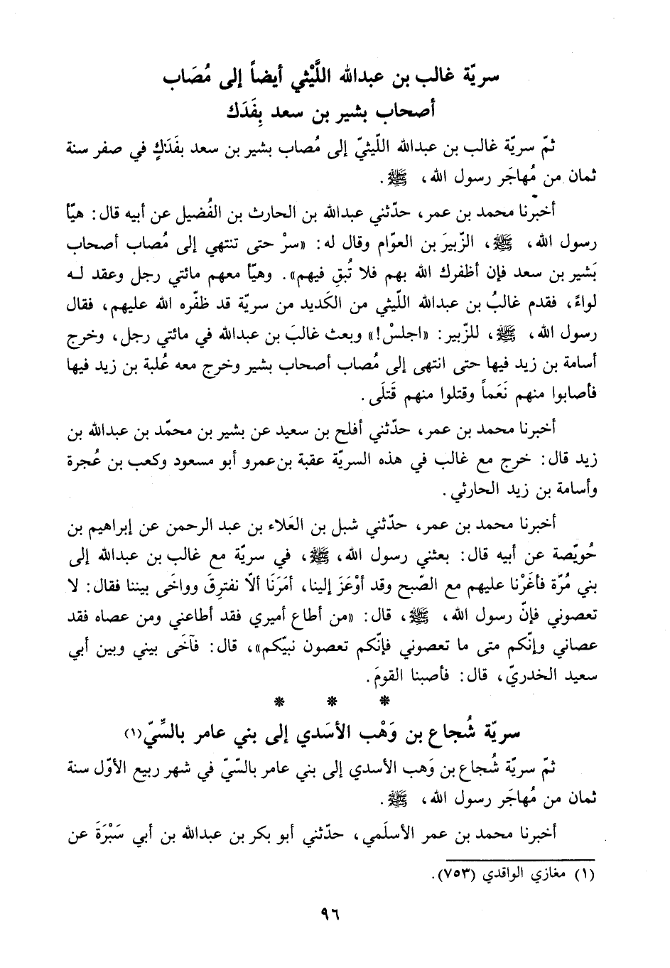 [أَخْبَرَنَا مُحَمَّدُ بْنُ عُمَرَ. حَدَّثَنِي عَبْدُ اللَّهِ بْنُ الْحَارِثِ بْنِ الْفُضَيْلِ عَنْ أَبِيهِ قَالَ: هَيَّأَ رَسُولُ اللَّهِ - صَلَّى اللَّهُ عَلَيْهِ وَسَلَّمَ - الزُّبَيْرَ بْنَ الْعَوَّامِ وَقَالَ لَهُ: سِرْ حَتَّى تَنْتَهِيَ إِلَى مُصَابِ أَصْحَابِ بَشِيرِ بْنِ سَعْدٍ فَإِنْ أَظْفَرَكَ اللَّهُ بِهِمْ فَلا تُبْقِ فِيهِمْ] . وَهَيَّأَ مَعَهُمْ مِائَتَيْ رَجُلٍ وَعَقَدَ لَهُ لِوَاءً. فَقَدِمَ غَالِبُ بْنُ عَبْدِ اللَّهِ اللَّيْثِيُّ مِنَ الْكَدِيدِ مِنْ سَرِيَّةٍ قَدْ ظَفَّرَهُ اللَّهُ عَلَيْهِمْ. فَقَالَ رَسُولُ اللَّهِ - صَلَّى اللَّهُ عَلَيْهِ وَسَلَّمَ - لِلزُّبَيْرِ: اجْلِسْ! وَبَعَثَ غَالِبَ بْنَ عَبْدِ اللَّهِ فِي مِائَتَيْ رَجُلٍ. وَخَرَجَ أُسَامَةُ بْنُ زَيْدٍ فِيهَا حَتَّى انْتَهَى إِلَى مُصَابِ أَصْحَابِ بَشِيرٍ وَخَرَجَ مَعَهُ عُلْبَةُ بْنُ زَيْدٍ فِيهَا فَأَصَابُوا مِنْهُمْ نَعَمًا وَقَتَلُوا مِنْهُمْ قَتْلَى.