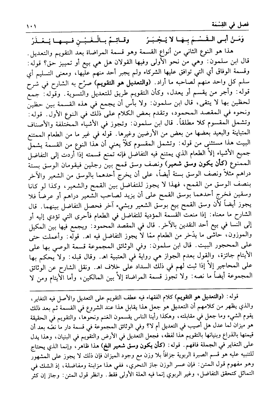 وقوله جمع لحظين بها لا يتقى قال ابن سلمون ولا بأس أن يجمع في هذه القسمة بين حظين ونحوه في المقصد المحمود وتقدم بعض الكلام على ذلك في النوع الأول قوله وتشمل المقسوم كلا مطلقا قال ابن سلمون وتجوز في الأشياء المختلفة والأصناف المتباينة والبعيد بعضها من بعض من الأرضين وغيرها قوله في غير ما من الطعام الممتنع البيت هذا مستثنى من قوله وتشمل المقسوم كلا يعني أن هذا النوع من القسمة يشمل جميع الأشياء إلا الطعام الذي يمتنع فيه التفاضل فإنه تمنع قسمته إذا أردت إلى التفاضل الممنوع كأن يكون وسق شعير ونصف وسق قمح بين رجلين فيقومان الوسق بستة دراهم مثلا ونصف الوسق بستة أيضا على أن يخرج أحدهما بالوسق من الشعير والآخر بنصف الوسق من القمح فهذا لا يجوز للتفاضل بين القمح والشعير