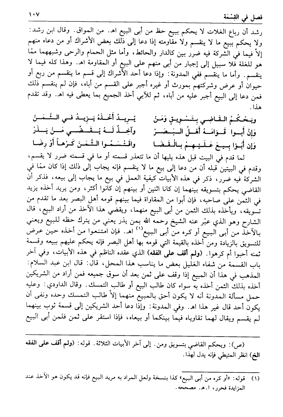 ومن أخذه بالقيمة التي قومه بها أهل البصر فإنه يحكم عليهم ببيعه وقسمة ثمنه أحبوا أم كرهوا ولم أقف على الفقه الذي عقده الناظم في هذه الأبيات وفي آخر باب القسمة من شفاء الغليل بعض ما يناسب هذا المحل قال قال ابن عبد السلام المذهب في هذا أن المبيع إذا وقف على ثمن بعد أن سوق جميعه فمن أراد من الشريكين أخذه بذلك الثمن أخذه به سواء كان طالب البيع أو طالب التمسك وقال الداودي وعليه حمل مسألة المدونة أنه لا يكون أحق بالمبيع منهما إلا طالب التمسك وحده ونفى أن يكون أحد قال غير هذا ا هـ