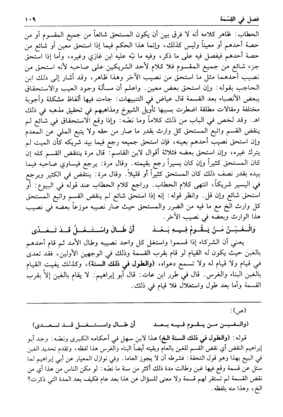 الحطاب ظاهر كلامه أنه لا فرق بين أن يكون المستحق شائعا من جميع المقسوم أو من حصة أحدهم أو معينا وليس كذلك وإنما هذا الحكم فيما إذا استحق معين أو شائع من حصة أحدهم فيفصل فيه على ما ذكر وفيه ما نبه عليه ابن غازي وغيره وأما إذا استحق جزء شائع من جميع المقسوم فلا كلام لأحد الشريكين على صاحبه لأنه استحق من نصيب أحدهما مثل ما استحق من نصيب الآخر وهذا ظاهر وقد أشار إلى ذلك ابن الحاجب بقوله وإن استحق بعض معين