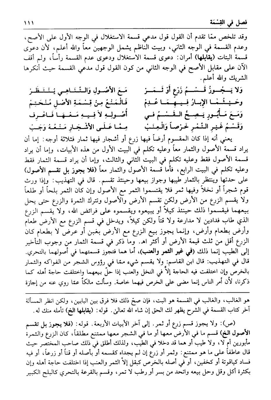 ولا يجوز قسم زرع أو ثمر مع الأصول والتناهي ينتظر وحيثما الإبار فيهما عدم فالمنع من قسمة الأصل منحتم ومع مأبور يصح القسم في أصوله لا فيه معها فاعرف وقسم غير التمر خرصا والعنب مما على الأشجار منعه وجب يعني أنه إذا كان المقسوم أرضا فيها زرع أو أشجار فيها ثمار فثلاثة أوجه إما أن يراد قسمة الأصول والثمار معا وعليه تكلم في البيت الأول من هذه الأبيات