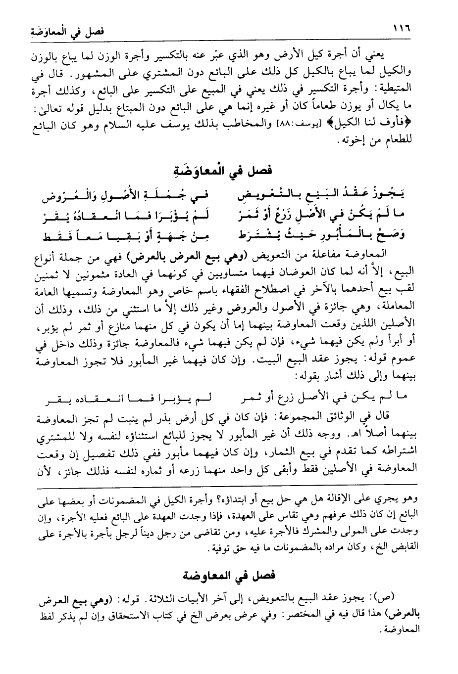 فصل في المعاوضة يجوز عقد البيع بالتعويض في جملة الأصول والعروض ما لم يكن في الأصل زرع أو ثمر لم يؤبرا فما انعقاده يقر 993 وصح بالمأبور حيث يشترط من جهة أو بقيا معا فقط المعاوضة مفاعلة من التعويض وهي بيع العرض بالعرض فهي من جملة أنواع البيع إلا أنه لما كان العوضان فيهما متساويين في كونهما في العادة مثمونين لا ثمنين لقب بيع أحدهما بالآخر في اصطلاح الفقهاء باسم خاص وهو المعاوضة وتسميها العامة المعاملة وهي جائزة في الأصول والعروض وغير ذلك إلا ما استثني من ذلك وذلك أن الأصلين اللذين وقعت المعاوضة بينهما إما أن يكون في كل منهما منازع أو ثمر لم يؤبر أو أبرأ ولم يكن فيهما شيء فإن لم يكن فيهما شيء فالمعاوضة جائزة وذلك داخل في عموم قوله يجوز عقد البيع البيت