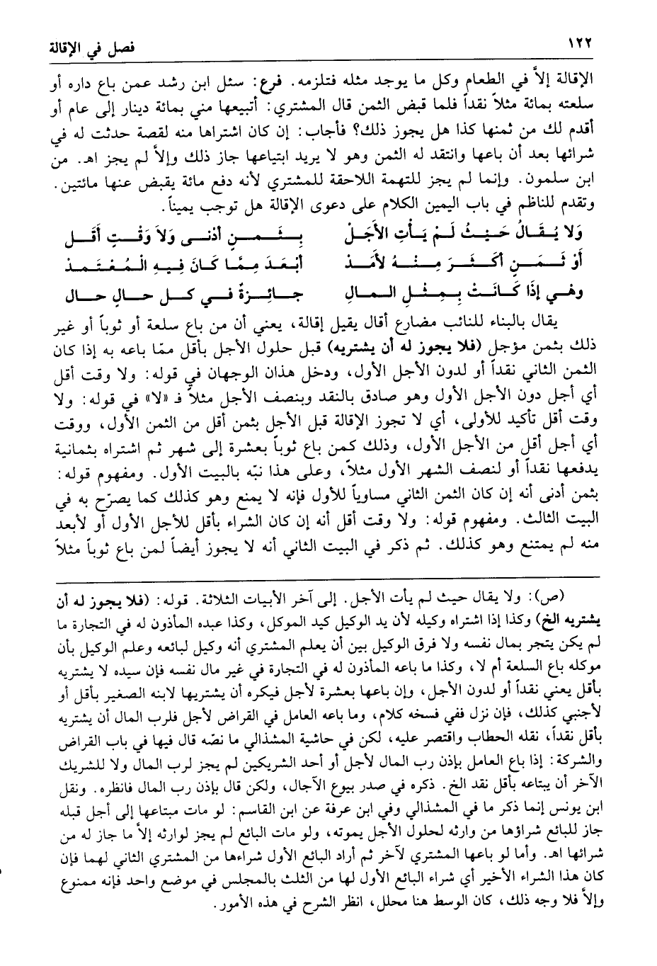 ولا يقال حيث لم يأت الأجل بثمن أدنى ولا وقت أقل أو ثمن أكثر منه لأمد أبعد مما كان فيه المعتمد وهي إذا كانت بمثل المال جائزة في كل حال حال يقال بالبناء للنائب مضارع أقال يقيل إقالة يعني أن من باع سلعة أو ثوبا أو غير ذلك بثمن مؤجل فلا يجوز له أن يشتريه قبل حلول الأجل بأقل مما باعه به إذا كان الثمن الثاني نقدا أو لدون الأجل الأول ودخل هذان الوجهان في قوله ولا وقت أقل أي أجل دون الأجل الأول وهو صادق بالنقد وبنصف الأجل مثلا فلا في قوله ولا وقت أقل تأكيد للأولى أي لا تجوز الإقالة قبل الأجل بثمن أقل من الثمن الأول ووقت أي أجل أقل من الأجل الأول وذلك كمن باع ثوبا
