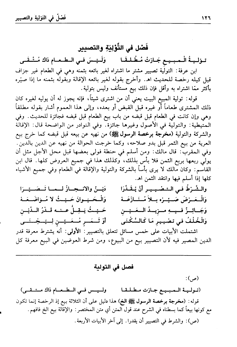 فصل في التولية والتصيير تولية المبيع جازت مطلقا وليس في الطعام ذاك متقى ابن عرفة التولية تصيير مشتر ما اشتراه لغير بائعه بثمنه وهي في الطعام غير جزاف قبل كيله رخصة للحديث ا هـ وأخرج بقوله لغير بائعه الإقالة وبقوله بثمنه ما إذا صيره بأكثر مما اشتراه به وأقل فإن ذلك بيع مستأنف وليس بتولية قوله تولية المبيع