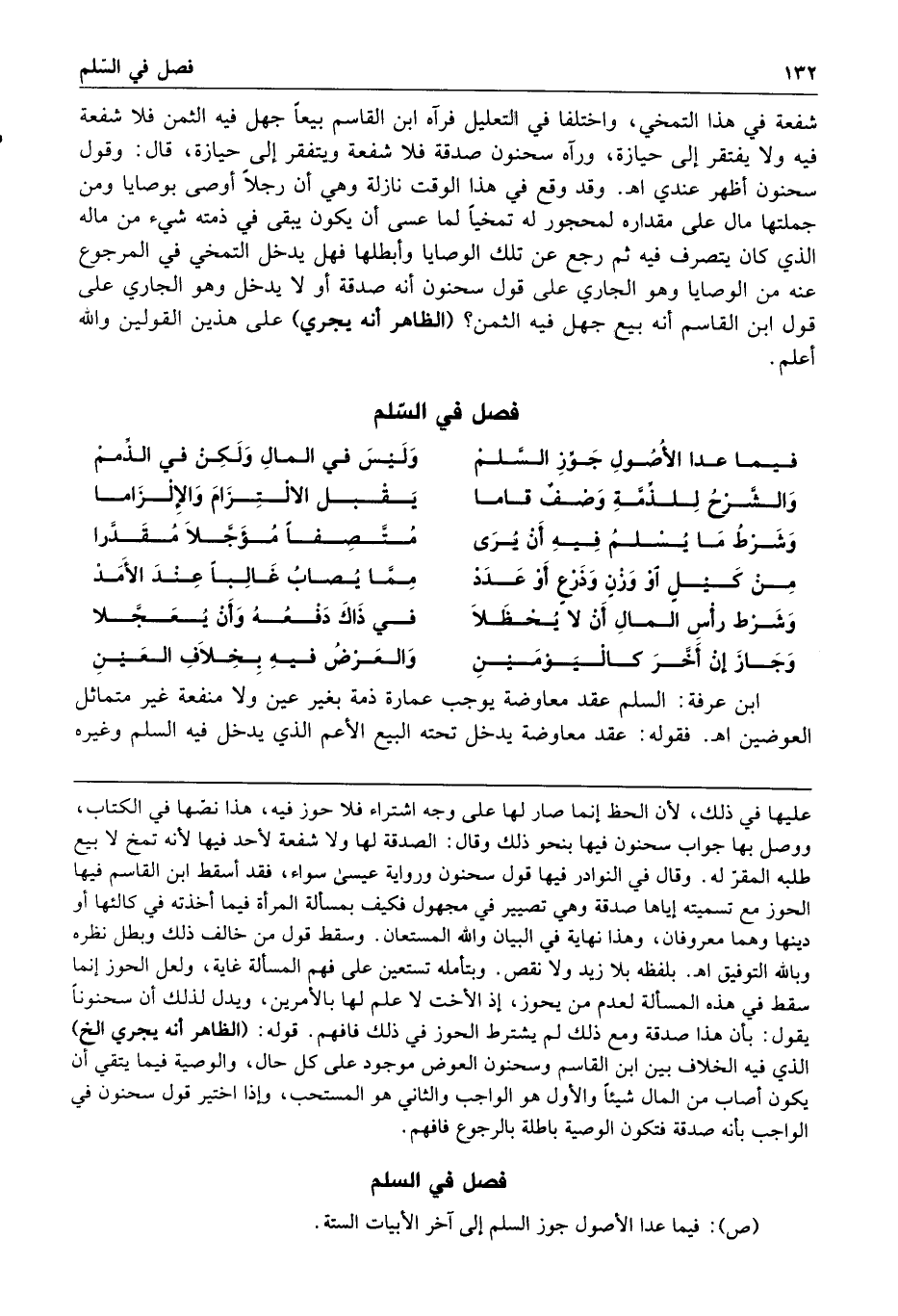 فصل في السلم فيما عدا الأصول جوز السلم وليس في المال ولكن في الذمم والشرح للذمة وصف قاما يقبل الالتزام والإلزاما وشرط ما يسلم فيه أن يرى متصفا مؤجلا مقدرا 1019 من كيل أو وزن وذرع أو عدد مما يصاب غالبا عند الأمد وشرط رأس المال أن لا يحظلا في ذاك دفعه وأن يعجلا وجاز إن أخر كاليومين والعرض فيه بخلاف العين ابن عرفة السلم عقد معاوضة يوجب عمارة ذمة بغير عين ولا منفعة غير متماثل العوضين ا هـ