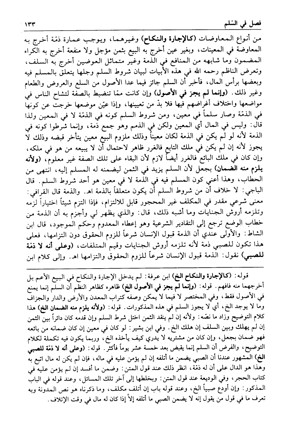 من أنواع المعاوضات كالإجارة والنكاح وغيرهما ويوجب عمارة ذمة أخرج به المعاوضة في المعينات وبغير عين أخرج به البيع بثمن مؤجل ولا منفعة أخرج به الكراء المضمون وما شابهه من المنافع في الذمة وغير متماثل العوضين أخرج به السلف وتعرض الناظم رحمه الله في هذه الأبيات لبيان شروط السلم وجلها يتعلق بالمسلم فيه وبعضها برأس المال فأخبر أن السلم جائز فيما عدا الأصول من السلع والعروض والطعام وغير ذلك وإنما لم يجز في الأصول وإن كانت مما تنضبط بالصفة لتشاح الناس في مواضعها واختلاف أغراضهم فيها فلا بد من تعيينها وإذا عين موضعها خرجت عن كونها في الذمة وصار سلما في معين ومن شروط السلم كونه في الذمة لا في المعين ولذا قال وليس في المال أي المعين ولكن في الذمم وهو جمع ذمة وإنما شرطوا كونه في الذمة لأنه لو لم يكن في الذمة لكان معينا وذلك ملزوم البيع معين يتأخر قبضه وذلك لا يجوز لأنه إن لم يكن في ملك البائع فالغرر ظاهر لاحتمال أن لا يبيعه من هو في ملكه وإن كان في ملك البائع فالغرر أيضا لازم لأن البقاء على تلك الصفة غير معلوم ولأنه يلزم منه الضمان بجعل لأن السلم يزيد في الثمن ليضمنه له المسلم إليه