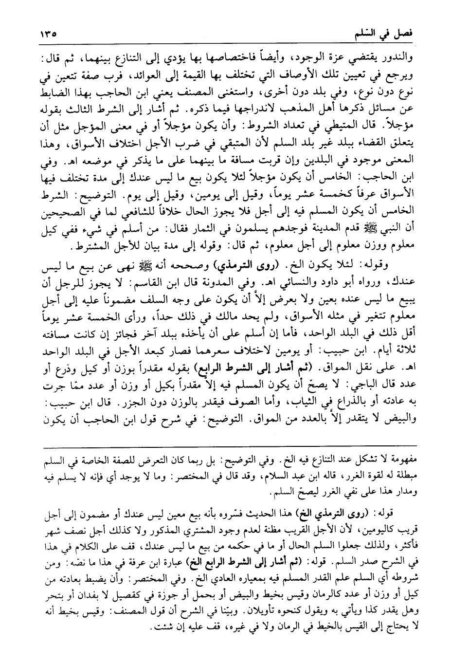 والندور يقتضي عزة الوجود وأيضا فاختصاصها بها يؤدي إلى التنازع بينهما ثم قال ويرجع في تعيين تلك الأوصاف التي تختلف بها القيمة إلى العوائد فرب صفة تتعين في نوع دون نوع وفي بلد دون أخرى واستغنى المصنف يعني ابن الحاجب بهذا الضابط عن مسائل ذكرها أهل المذهب لاندراجها فيما ذكره ثم أشار إلى الشرط الثالث بقوله مؤجلا قال المتيطي في تعداد الشروط وأن يكون مؤجلا أو في معنى المؤجل مثل أن يتعلق القضاء ببلد غير بلد السلم لأن المتبقي في ضرب الأجل اختلاف الأسواق وهذا المعنى موجود في البلدين وإن قربت مسافة ما بينهما على ما يذكر في موضعه ا هـ
