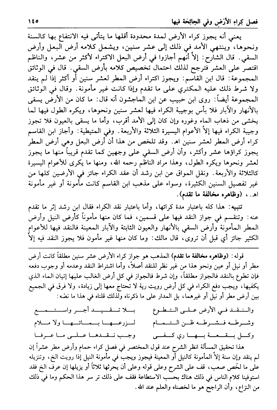 وقد تلخص من هذا أن أرض البعل وهي أرض المطر يجوز كراؤها عشرا وأكثر وأن أرض السقي على وجهين كما تقدم قريبا منها ما يجوز لعشر ونحوها ويكره الطول وهذا مراد الناظم رحمه الله ومنها ما يكرى للأعوام اليسيرة كالثلاثة والأربعة ونقل المواق عن ابن رشد أن عقد الكراء جائز في الأرضين كلها من غير تفصيل السنين الكثيرة وسواء على مذهب ابن القاسم كانت مأمونة أو غير مأمونة ا هـ