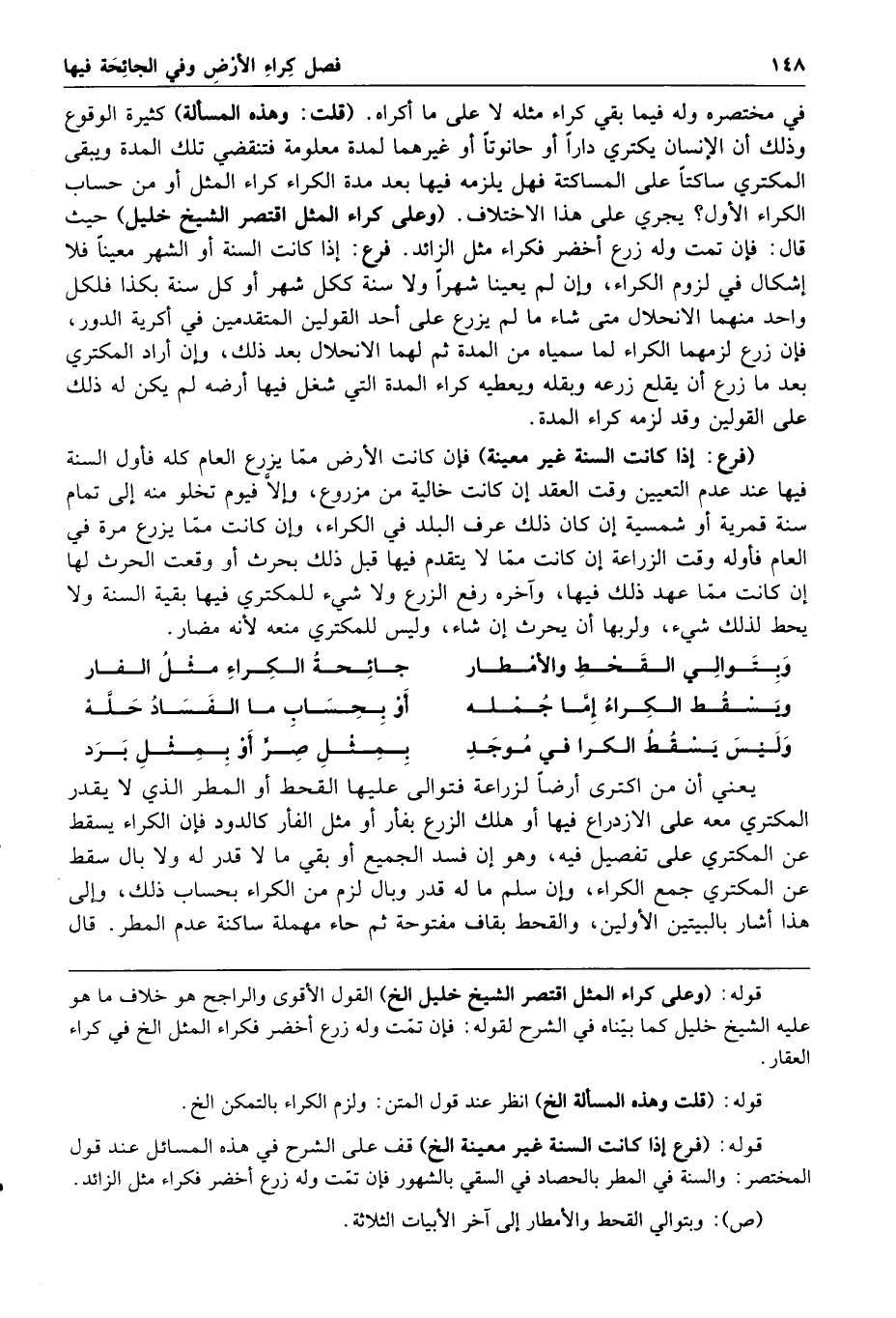 وبتوالي القحط والأمطار جائحة الكراء مثل الفار ويسقط الكراء إما جمله أو بحساب ما الفساد حله وليس يسقط الكرا في موجد بمثل صر أو بمثل برد يعني أن من اكترى أرضا لزراعة فتوالى عليها القحط أو المطر الذي لا يقدر المكتري معه على الازدراع فيها أو هلك الزرع بفأر أو مثل الفأر كالدود فإن الكراء يسقط عن المكتري على تفصيل فيه وهو إن فسد الجميع أو بقي ما لا قدر له ولا بال سقط عن المكتري جميع الكراء وإن سلم ما له قدر وبال لزم من الكراء بحساب ذلك وإلى هذا أشار بالبيتين الأولين والقحط بقاف مفتوحة ثم حاء مهملة ساكنة عدم المطر