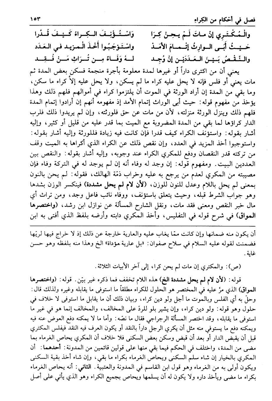 والمكتري إن مات لم يحن كرا واستؤنف الكراء كيف قدرا حيث أبى الوراث إتمام الأمد واستوجبوا أخذ المزيد في العدد والنقص بين العددين إن وجد له وفاء من تراث من فقد يعني أن من اكترى دارا أو غيرها لمدة معلومة بأجرة منجمة فسكن بعض المدة ثم مات يعني أو أفلس فإنه لا يحل عليه كراء ما لم يسكن ولا يحل عليه إلا كراء ما سكن وما بقي من المدة إن أراد الورثة في الموت أن يلتزموا كراء في أموالهم فلهم ذلك وهذا يؤخذ من مفهوم قوله حيث أبى الوراث إتمام الأمد إذ مفهومه أنهم إن أرادوا إتمام المدة فلهم ذلك وينزل الورثة منزلته لأن من مات عن حق فلورثته وإن لم يريدوا ذلك فلرب الدار كراؤها لما بقي من المدة المضروبة مع الميت بما قدر عليه من قليل أو كثير وإليه أشار بقوله واستؤنف الكراء كيف قدرا فإن كانت فيه زيادة فللورثة وإليه أشار بقوله واستوجبوا أخذ المزيد في العدد وإن نقص ذلك عن الكراء الذي أكراها به الميت وقف من تركته قدر النقصان ودفع للمكري الكراء عند وجوبه وإليه أشار بقوله والنقص بين العددين البيت