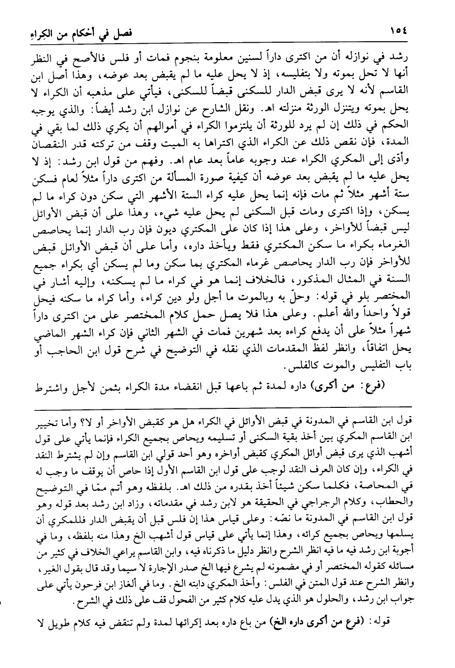 رشد في نوازله أن من اكترى دارا لسنين معلومة بنجوم فمات أو فلس فالأصح في النظر أنها لا تحل بموته ولا بتفليسه إذ لا يحل عليه ما لم يقبض بعد عوضه وهذا أصل ابن القاسم لأنه لا يرى قبض الدار للسكنى قبضا للسكنى فيأتي على مذهبه أن الكراء لا يحل بموته ويتنزل الورثة منزلته