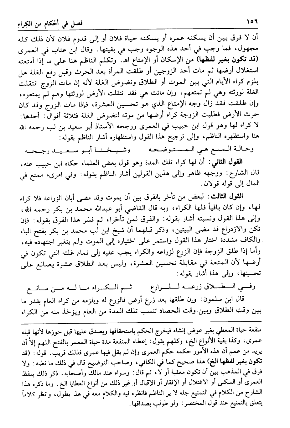 أحدها لا كراء لها وهو قول ابن حبيب في العمرى ورجحه الأستاذ أبو سعيد بن لب رحمه الله هنا واستظهره الناظم وإلى ترجيح هذا القول واستظهاره أشار الناظم بقوله وحالة المنع هي المستوضحه وشيخنا أبو سعيد رجحه القول الثاني أن لها كراء تلك المدة وهو قول بعض العلماء حكاه ابن حبيب عنه قال الشارح ووجهه ظاهر وإلى هذين القولين أشار الناظم بقوله وفي امرئ ممتع في المال إلى قوله قولان القول الثالث لبعض من تأخر بالفرق بين أن يموت وقد مضى إبان الزراعة فلا كراء لها وإن كان باقيا فلها الكراء وبه قال القاضي أبو عبد الله محمد بن بكر رحمه الله وإلى هذا القول ونسبته أشار بقوله والفرق لمن تأخرا ثم فسر هذا الفرق بقوله فإن تكن والازدراع قد مضى البيتين وذكر قبلهما أن شيخ ابن لب محمد بن بكر بفتح الباء والكاف مشددة اختار هذا القول واستمر على اختياره إلى الموت ولم يتغير اجتهاده فيه وأما إذا طلق الزوجة فإن الزرع لزراعه والكراء يجب عليه إلى تمام غلته التي تكون في أرضها لأن المتعة في مقابلة تحسين العشرة وليس بعد الطلاق عشرة يصانع على تحسينها وإلى هذا أشار بقوله وفي الطلاق زرعه للزارع ثم الكراء ما له من مانع قال ابن سلمون وإن طلقها بعد زرع أرض فالزرع له ويلزمه من كراء العام بقدر ما بين وقت الطلاق وبين وقت الحصاد تنسب تلك المدة من العام ويؤخذ منه من الكراء