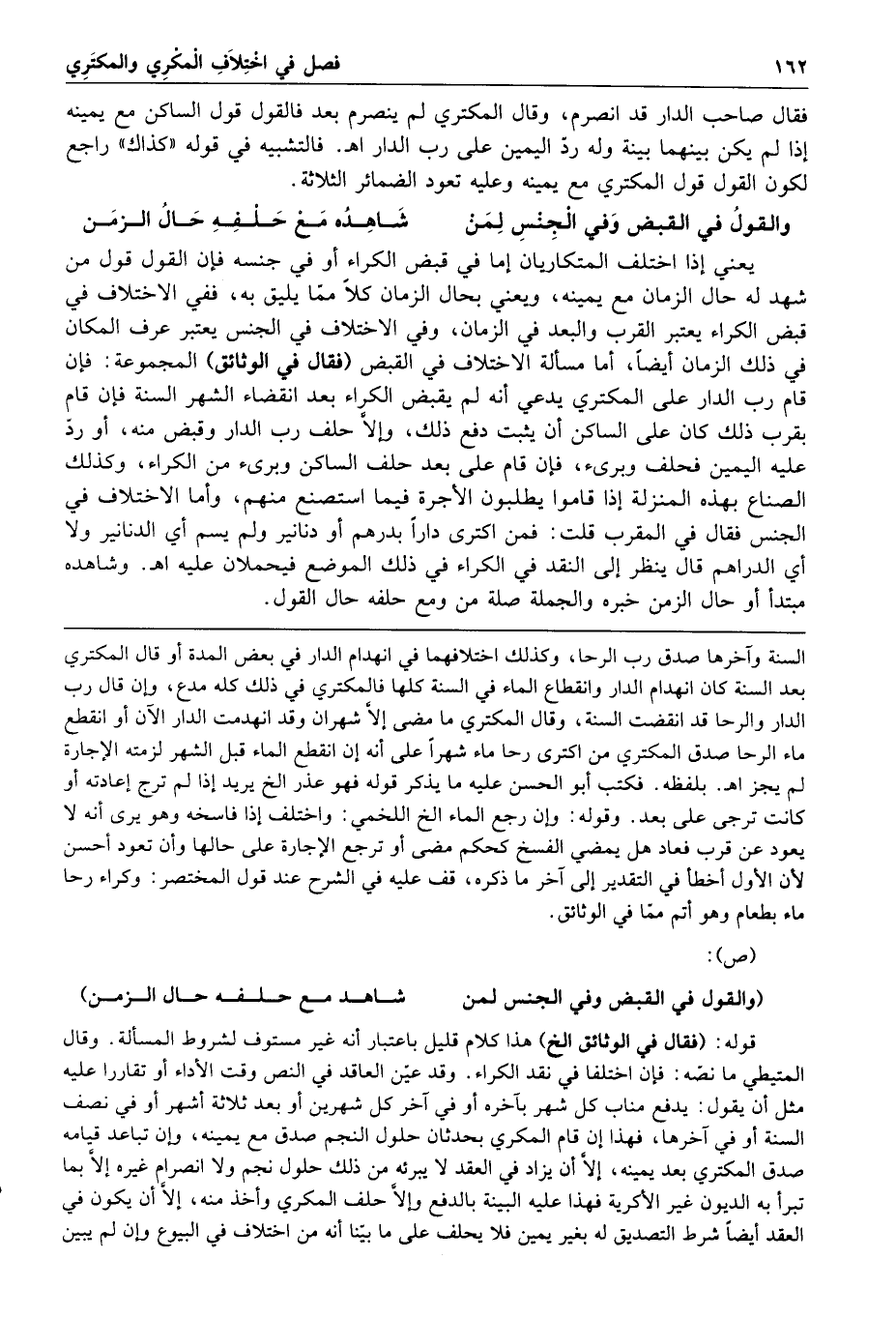 فقال صاحب الدار قد انصرم وقال المكتري لم ينصرم بعد فالقول قول الساكن مع يمينه إذا لم يكن بينهما بينة وله رد اليمين على رب الدار ا هـ فالتشبيه في قول كذاك راجع لكون القول قول المكتري مع يمينه وعليه تعود الضمائر الثلاثة والقول في القبض وفي الجنس لمن شاهده مع حلفه حال الزمن يعني إذا اختلف المتكاريان إما في قبض الكراء أو في جنسه فإن القول قول من شهد له حال الزمان مع يمينه ويعني بحال الزمان كلا مما يليق به ففي الاختلاف في قبض الكراء يعتبر القرب والبعد في الزمان وفي الاختلاف في الجنس يعتبر عرف المكان في ذلك الزمان أيضا أما مسألة الاختلاف في القبض فقال في الوثائق المجموعة فإن قام رب الدار على المكتري يدعي أنه لم يقبض الكراء بعد انقضاء أشهر السنة فإن قام بقرب ذلك كان على الساكن أن يثبت دفع ذلك وإلا حلف رب الدار وقبض منه أو رد عليه اليمين فحلف وبرئ فإن قام على بعد حلف الساكن وبرئ من الكراء وكذلك الصناع بهذه المنزلة إذا قاموا يطلبون الأجرة فيما استصنع منهم وأما الاختلاف في الجنس فقال في المقرب قلت فمن اكترى دارا بدراهم أو دنانير ولم يسم أي الدنانير ولا أي الدراهم قال ينظر إلى النقد في الكراء في ذلك الموضع فيحملان عليه ا هـ