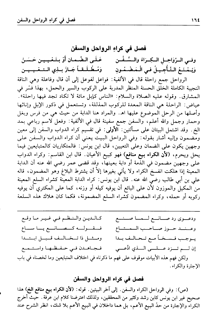 الأولى في تقسيم كراء الدواب والسفن إلى معين ومضمون وإليه أشار بقوله وفي الرواحل البيت يعني أن كراء الدواب والسفن على وجهين يكون على الضمان وعلى التعيين قال ابن يونس فالمتكاريان كالمتبايعين فيما يحل ويحرم لأن الكراء بيع منافع فهو كبيع الأعيان قال ابن القاسم وكراء الدواب على وجهين مضمون في الذمة أو دابة بعينها وقد قضى عمر رضي الله عنه أن الدابة المعينة إذا هلكت انفسخ الكراء ولا يأتي بغيرها إلا أن يشترط البلاغ وهو المضمون قاله علي بن أبي طالب رضي الله عنه قال ابن يونس كراء الدابة المعينة كشراء السلع المعينة من المكيل والموزون لأن على البائع أن يوفيه كيله أو وزنه كما على المكتري أن يوفيه ركوبه أو حمله وكراء المضمون كشراء السلع المضمونة فكما كان هلاك هذه السلعة