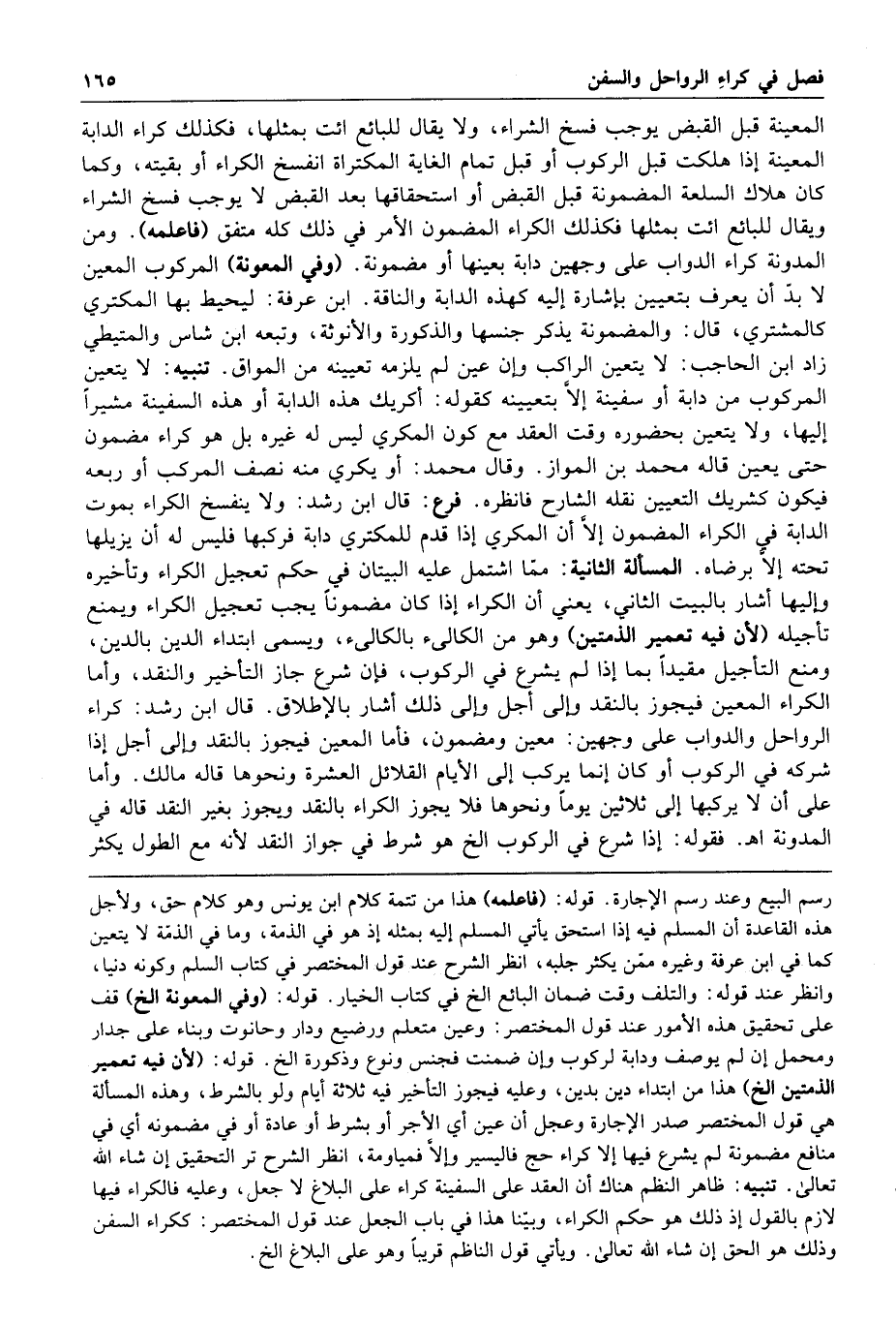 المسألة الثانية مما اشتمل عليه البيتان في حكم تعجيل الكراء وتأخيره وإليها أشار بالبيت الثاني يعني أن الكراء إذا كان مضمونا يجب تعجيل الكراء ويمنع تأجيله لأن فيه تعمير الذمتين وهو من الكالئ بالكالئ ويسمى ابتداء الدين بالدين ومنع التأجيل مقيدا بما إذا لم يشرع في الركوب فإن شرع جاز التأخير والنقد وأما الكراء المعين فيجوز بالنقد وإلى أجل وإلى ذلك أشار بالإطلاق قال ابن رشد كراء الرواحل والدواب على وجهين معين ومضمون فأما المعين فيجوز بالنقد وإلى أجل إذا شركه في الركوب أو كان إنما يركب إلى الأيام القلائل العشرة ونحوها قاله مالك وأما على أن لا يركبها إلى ثلاثين يوما ونحوها فلا يجوز الكراء بالنقد ويجوز بغير النقد قاله في المدونة ا هـ