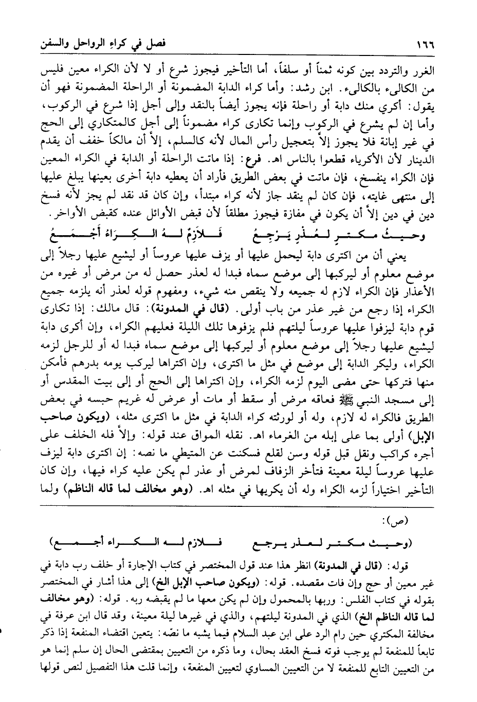 وحيث مكتر لعذر يرجع فلازم له الكراء أجمع يعني أن من اكترى دابة ليحمل عليها أو يزف عليها عروسا أو ليشيع عليها رجلا إلى موضع معلوم أو ليركبها إلى موضع سماه فبدا له لعذر حصل له من مرض أو غيره من الأعذار فإن الكراء لازم له جميعه ولا ينقص منه شيء ومفهوم قوله لعذر أنه يلزمه جميع الكراء إذا رجع من غير عذر من باب أولى