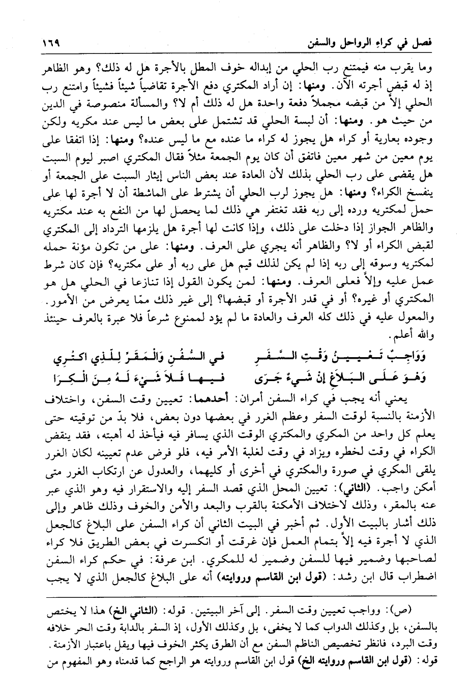 وواجب تعيين وقت السفر في السفن والمقر للذي اكتري وهو على البلاغ إن شيء جرى فيها فلا شيء له من الكرا يعني أنه يجب في كراء السفن أمران أحدهما تعيين وقت السفر لاختلاف الأزمنة بالنسبة لوقت السفر وعظم الغرر في بعضها دون بعض فلا بد من توقيته حتى يعلم كل واحد من المكري والمكتري الوقت الذي يسافر فيه فيأخذ له أهبته فقد ينقص الكراء في وقت لخطره ويزاد في وقت لغلبة الأمن فيه فلو فرض عدم تعيينه لكان الغرر يلقى المكري في صورة والمكتري في أخرى أو كليهما والعدول عن ارتكاب الغرر متى أمكن واجب الثاني تعيين المحل الذي قصد السفر إليه والاستقرار فيه وهو الذي عبر عنه بالمقر وذلك لاختلاف الأمكنة بالقرب والبعد والأمن والخوف وذلك ظاهر وإلى ذلك أشار بالبيت الأول ثم أخبر في البيت الثاني أن كراء السفن على البلاغ كالجعل الذي لا أجرة فيه