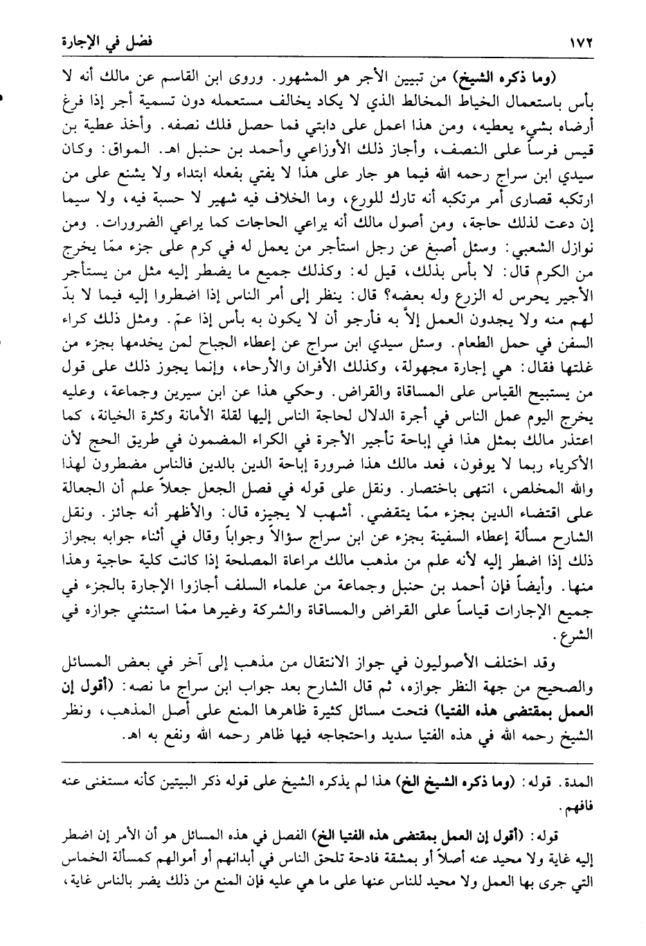 انتهى باختصار ونقل على قوله في فصل الجعل جعلا علم أن الجعالة على اقتضاء الدين بجزء مما يتقضي أشهب لا يجيزه قال والأظهر أنه جائز ونقل الشارح مسألة إعطاء السفينة بجزء عن ابن سراج سؤالا وجوابا وقال في أثناء جوابه بجواز ذلك إذا اضطر إليه لأنه علم من مذهب مالك مراعاة المصلحة إذا كانت كلية حاجية وهذا منها وأيضا فإن أحمد بن حنبل وجماعة من علماء السلف أجازوا الإجارة بالجزء في جميع الإجارات قياسا على القراض والمساقاة والشركة وغيرها مما استثني جوازه في الشرع وقد اختلف الأصوليون في جواز الانتقال من مذهب إلى آخر في بعض المسائل والصحيح من جهة النظر جوازه ثم قال الشارح بعد جواب ابن سراج ما نصه أقول إن العمل بمقتضى هذه الفتيا فتحت مسائل كثيرة ظاهرها المنع على أصل المذهب ونظر الشيخ رحمه الله في هذه الفتيا سديد واحتجاجه فيها ظاهر رحمه الله ونفع به ا هـ
