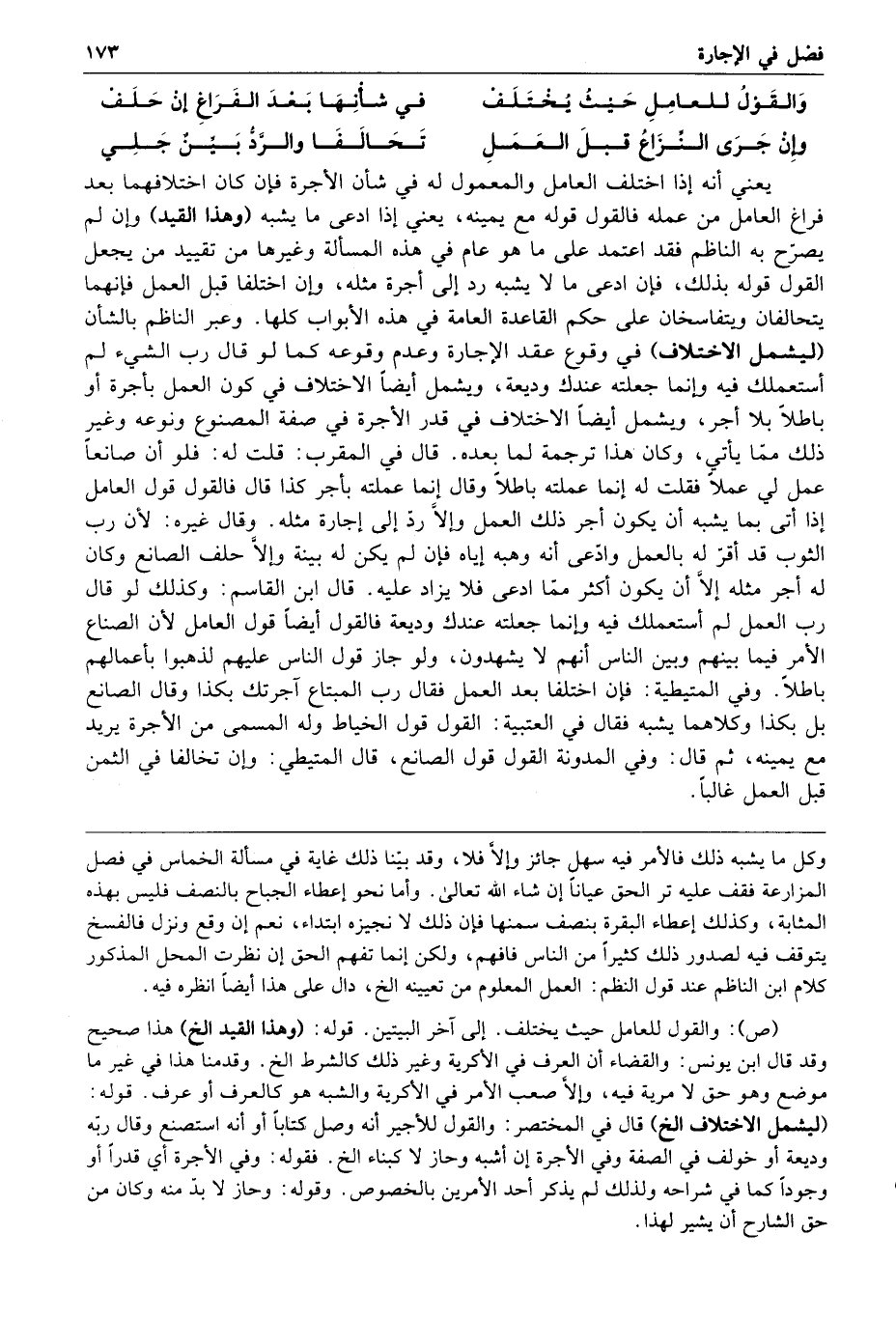 والقول للعامل حيث يختلف في شأنها بعد الفراغ إن حلف وإن جرى النزاع قبل العمل تحالفا والفسخ بين جلي يعني أنه إذا اختلف العامل والمعمول له في شأن الأجرة فإن كان اختلافهما بعد فراغ العامل من عمله فالقول قوله مع يمينه يعني إذا ادعى ما يشبه وهذا القيد وإن لم يصرح به الناظم فقد اعتمد على ما هو عام في هذه المسألة وغيرها من تقييد من يجعل القول قوله بذلك فإن ادعى ما لا يشبه رد إلى أجرة مثله وإن اختلفا قبل العمل فإنهما يتحالفان ويتفاسخان على حكم القاعدة العامة في هذه الأبواب كلها وعبر الناظم بالشأن ليشمل الاختلاف في وقوع عقد الإجارة وعدم وقوعه كما لو قال رب الشيء لم أستعملك فيه وإنما جعلته عندك وديعة ويشمل أيضا الاختلاف في كون العمل بأجرة أو باطلا بلا أجر ويشمل أيضا الاختلاف في قدر الأجرة في صفة المصنوع ونوعه وغير ذلك مما يأتي وكأن هذا ترجمة لما بعده