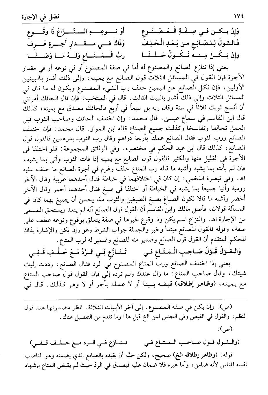 وإن يكن في صفة المصنوع أو نوعه النزاع ذا وقوع فالقول للصانع من بعد الحلف وذاك في مقدار أجرة عرف 1084 وإن يكن منه نكول حلفا رب المتاع وله ما وصفا يعني إذا تنازع الصانع والمصنوع له إما في صفة المصنوع أو في نوعه أو في مقدار الأجرة فإن القول في المسائل الثلاث قول الصانع مع يمينه وإلى ذلك أشار بالبيتين الأولين فإن نكل الصانع عن اليمين حلف رب الشيء المصنوع ويكون له ما قال في المسائل الثلاث وإلى ذلك أشار بالبيت الثالث قال في المنتخب فإن قال الحائك أمرتني أن أنسج ثوبك ثلاثا في ستة وقال ربه بل سبعا في أربع فالحائك مصدق مع يمينه كذلك قال ابن القاسم في سماع عيسى قال محمد وإن اختلف الحائك وصاحب الثوب قبل العمل تحالفا وتفاسخا وكذلك جميع الصناع قاله ابن المواز قال محمد فإن اختلف الصانع ورب الثوب فقال الصانع عملته بأربعة دراهم وقال رب الثوب بدرهمين فالقول قول الصانع كذلك قال ابن عبد الحكم في مختصره وفي الوثائق المجموعة فلو اختلفا في الأجرة في القليل منها والكثير فالقول قول الصانع مع يمينه إذا فات الثوب وأتى بما يشبه فإن لم يأت بما يشبه وأشبه ما قاله رب المتاع حلف وغرم في أجرة الصانع ما حلف عليه ا هـ