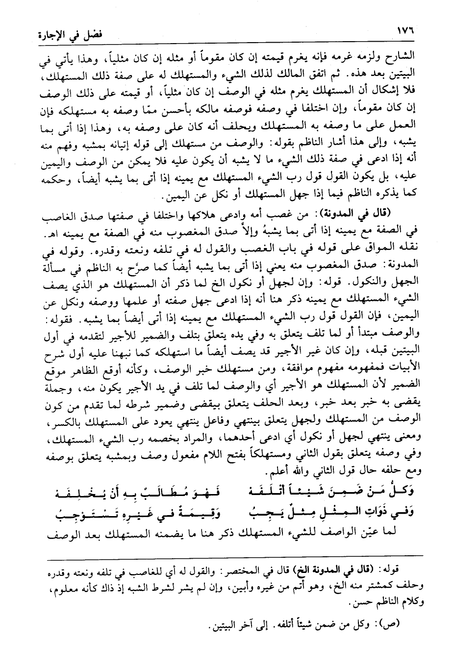 الشارح ولزمه غرمه فإنه يغرم قيمته إن كان مقوما أو مثله إن كان مثليا وهذا يأتي في البيتين بعد هذه ثم اتفق المالك لذلك الشيء والمستهلك له على صفة ذلك المستهلك فلا إشكال أن المستهلك يغرم مثله في الوصف إن كان مثليا أو قيمته على ذلك الوصف إن كان مقوما وإن اختلفا في وصفه فوصفه مالكه بأحسن مما وصفه به مستهلكه فإن العمل على ما وصفه به المستهلك ويحلف أنه كان على وصفه به وهذا إذا أتى بما يشبه وإلى هذا أشار الناظم بقوله والوصف من مستهلك إلى قوله إتيانه بمشبه وفهم منه أنه إذا ادعى في صفة ذلك الشيء ما لا يشبه أن يكون عليه فلا يمكن من الوصف واليمين عليه بل يكون القول قول رب الشيء المستهلك مع يمينه إذا أتى بما يشبه أيضا وحكمه كما يذكره الناظم فيما إذا جهل المستهلك أو نكل عن اليمين