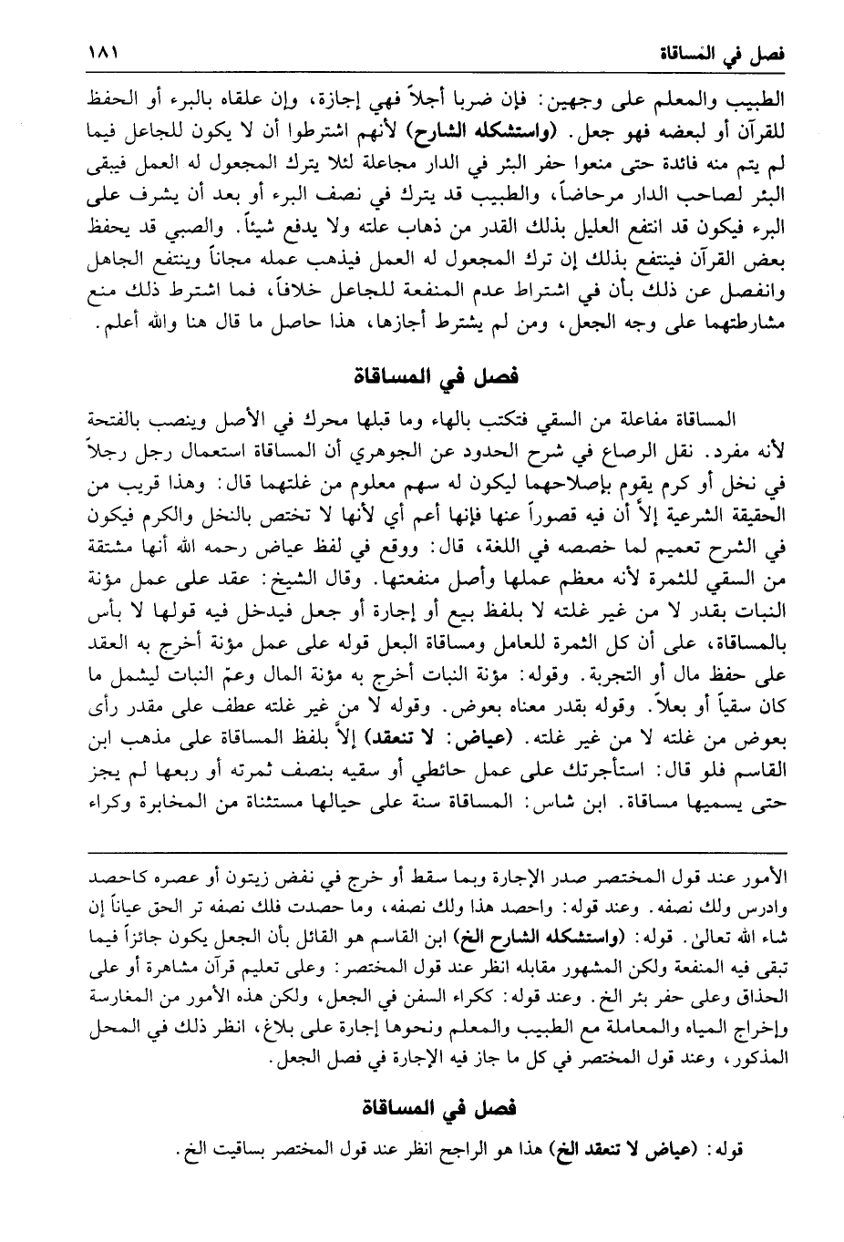 فصل في المساقاة المساقاة مفاعلة من السقي فتكتب بالهاء وما قبلها محرك في الأصل وينصب بالفتحة لأنه مفرد نقل الرصاع في شرح الحدود عن الجوهري أن المساقاة استعمال رجل رجلا في نخل أو كرم يقوم بإصلاحهما ليكون له سهم معلوم من غلتهما قال وهذا قريب من الحقيقة الشرعية إلا أن فيه قصورا عنها فإنها أعم أي لأنها لا تختص بالنخل والكرم فيكون في الشرح تعميم لما خصصه في اللغة قال ووقع في لفظ عياض رحمه الله أنها مشتقة من السقي للثمرة لأنه معظم عملها وأصل منفعتها