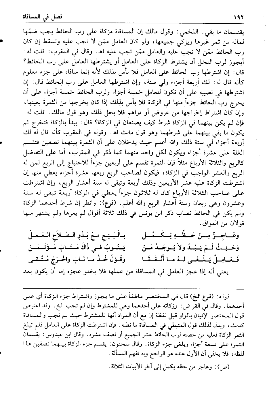 وقوله في المقرب كأنه قال له لك أربعة أجزاء لي ستة ذلك والله أعلم حيث يدخلان على أن الثمرة بينهما نصفين فتقسم الغلة على عشرة أجزاء ويكون لكل واحد منهما كما ذكر في المقرب إما على التفاضل كالربع والثلاثة الأرباع مثلا فإن الثمرة تقسم على أربعين جزءا للاحتياج إلى الربع لمن له الربع والعشر الواجب في الزكاة فيكون لصاحب الربع ربعها عشرة أجزاء يعطى منها إن اشترطت الزكاة عليه عشر الأربعين وذلك أربعة وتبقى له ستة أعشار الربع وإن اشترطت على صاحب الثلاثة الأرباع كان له ثلاثون جزءا يعطى في الزكاة أربعة تبقى له ستة وعشرون وهي ربعان وستة أعشار الربع والله أعلم فرع وانظر إن شرط أحدهما الزكاة ولم يكن في الحائط نصاب ذكر ابن يونس في ذلك ثلاثة أقوال لم يعزها ولم يشتهر منها قولان من المواق وعاجز من حظه يكمل بالبيع مع بدو الصلاح العمل وحيث لم يبد ولا يوجد من ينوب في ذاك مناب مؤتمن فعامل يلغى له ما أنفقا وقول خذ ما ناب وأخرج متقى يعني أنه إذا عجز العامل في المساقاة من عملها فلا يخلو عجزه إما أن يكون بعد