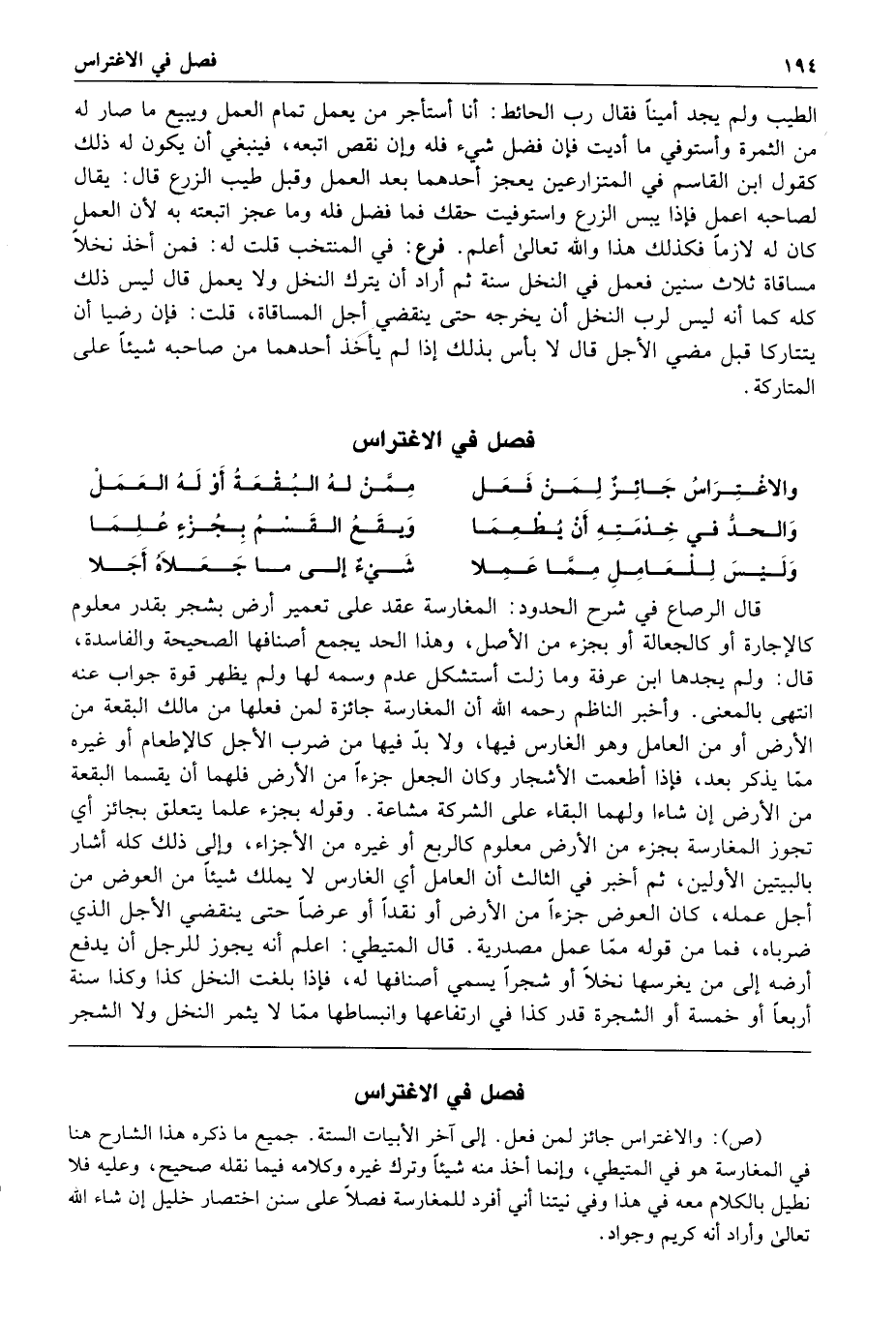 الطيب ولم يجد أمينا فقال رب الحائط أنا أستأجر من يعمل تمام العمل ويبيع ما صار له من الثمرة وأستوفي ما أديت فإن فضل شيء فله وإن نقص اتبعه فينبغي أن يكون له ذلك كقول ابن القاسم في المتزارعين يعجز أحدهما بعد العمل وقبل طيب الزرع قال يقال لصاحبه اعمل فإذا يبس الزرع واستوفيت حقك فما فضل فله وما عجز اتبعته به لأن العمل كان له لازما فكذلك هذا والله تعالى أعلم فرع في المنتخب قلت له فمن أخذ نخلا مساقاة ثلاث سنين فعمل في النخل سنة ثم أراد أن يترك النخل ولا يعمل قال ليس ذلك كله كما أنه ليس لرب النخل أن يخرجه حتى ينقضي أجل المساقاة قلت فإن رضيا أن يتتاركا قبل مضي الأجل قال لا بأس بذلك إذا لم يأخذ أحدهما من صاحبه شيئا على المتاركة فصل في الاغتراس والاغتراس جائز لمن فعل ممن له البقعة أو له العمل والحد في خدمته أن يطعما ويقع القسم بجزء علما وليس للعامل مما عملا شيء إلى ما جعلاه أجلا قال الرصاع في شرح الحدود المغارسة عقد على تعمير أرض بشجر بقدر معلوم كالإجارة أو كالجعالة أو بجزء من الأصل وهذا الحد يجمع أصنافها الصحيحة والفاسدة قال ولم يجدها ابن عرفة وما زلت أستشكل عدم وسمه لها ولم يظهر قوة جواب عنه انتهى بالمعنى وأخبر الناظم رحمه الله أن المغارسة جائزة لمن فعلها من مالك البقعة من الأرض أو من العامل وهو الغارس فيها ولا بد فيها من ضرب الأجل كالإطعام أو غيره مما يذكر بعد فإذا أطعمت الأشجار وكان الجعل جزءا من الأرض فلهما أن يقسما البقعة من الأرض إن شاءا ولهما البقاء على الشركة مشاعة