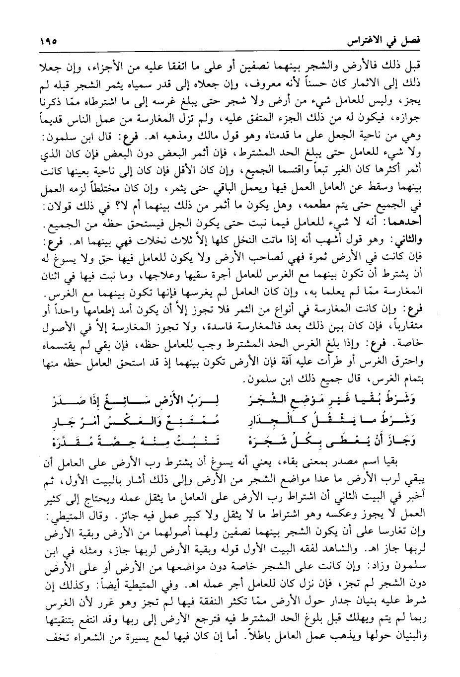 وفي المتيطية أيضا وكذلك إن شرط عليه بنيان جدار الأرض مما تكثر النفقة فيها لم تجز وهو غرر لأن الغرس ربما لم يتم ويهلك قبل بلوغ الحد المشترط فيه فترجع الأرض إلى ربها وقد انتفع بتنقيتها والبنيان حولها ويذهب عمل العامل باطلا أما إن كان فيها لمع يسيرة من الشعراء تخف