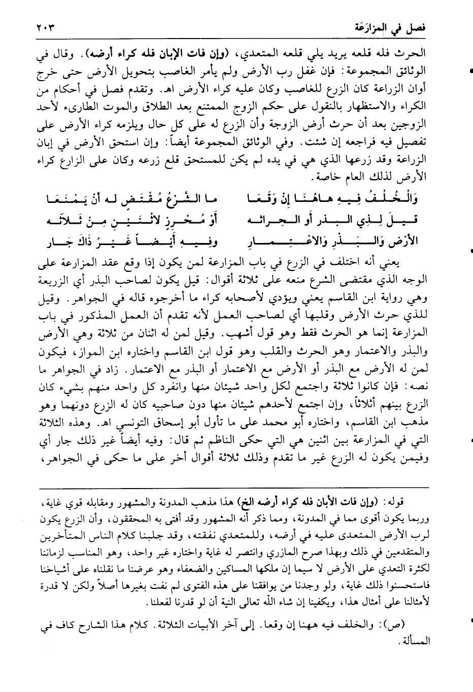 وتقدم فصل في أحكام من الكراء والاستظهار بالنقول على حكم الزوج الممتنع بعد الطلاق والموت الطارئ لأحد الزوجين بعد أن حرث أرض الزوجة وإن الزرع له على كل حال ويلزمه كراء الأرض على تفصيل فيه فراجعه إن شئت وفي الوثائق المجموعة أيضا وإن استحق الأرض في إبان الزراعة وقد زرعها الذي هي في يده لم يكن للمستحق قلع زرعه وكان على الزارع كراء الأرض لذلك العام خاصة والخلف فيه هاهنا إن وقعا ما الشرع مقتض له أن يمنعا قيل لذي البذر أو الحراثة أو محرز لاثنين من ثلاثة الأرض والبذر والاعتمار وفيه أيضا غير ذاك جار يعني أنه اختلف في الزرع في باب المزارعة لمن يكون إذا وقع عقد المزارعة على الوجه الذي مقتضى الشرع منعه على ثلاثة أقوال قيل يكون لصاحب البذر أي الزريعة وهي رواية ابن القاسم يعني ويؤدى لأصحابه كراء ما أخرجوه قاله في الجواهر وقيل للذي حرث الأرض وقلبها أي لصاحب العمل لأنه تقدم أن العمل المذكور في باب المزارعة إنما هو الحرث فقط وهو قول أشهب