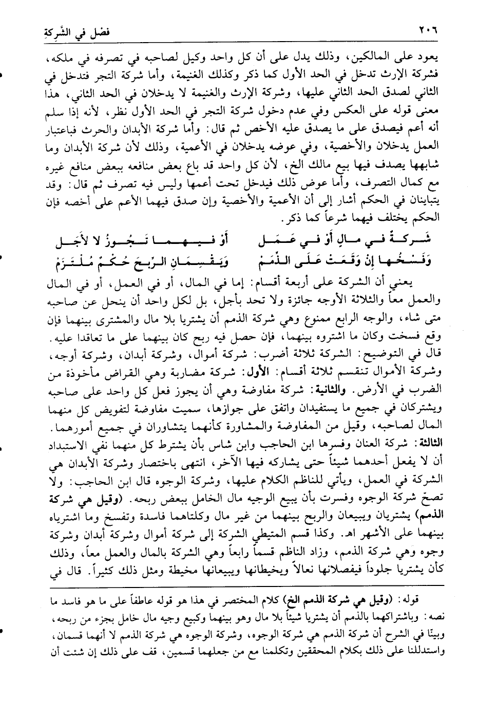 وكذا قسم المتيطي الشركة إلى شركة أموال وشركة أبدان وشركة وجوه وهي شركة الذمم وزاد الناظم قسما رابعا وهي الشركة بالمال والعمل معا وذلك كأن يشتريا جلودا فيفصلانها نعالا ويخيطانها ويبيعانها مخيطة ومثل ذلك كثيرا قال في