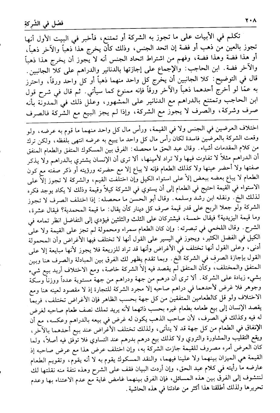 قال في التوضيح كلا الجانبين أن يخرج كل واحد منهما ذهبا أو كل واحد ورقا واحترز به عما لو أخرج أحدهما ذهبا والآخر ورقا فإنه ممنوع كما سيأتي ثم قال في شرح قول ابن الحاجب وتمتنع بالدراهم مع الدنانير على المشهور وعلل ذلك في المدونة بأنه صرف وشركة والصرف لا يجوز مع الشركة وإذا لم يجز البيع مع الشركة فالصرف