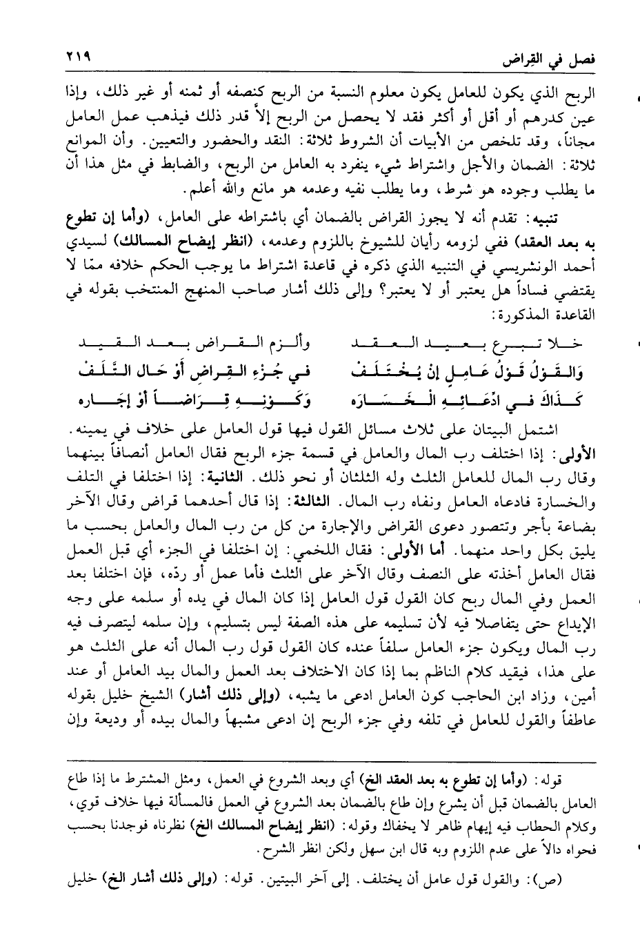 الربح الذي يكون للعامل يكون معلوم النسبة من الربح كنصفه أو ثمنه أو غير ذلك وإذا عين كدرهم أو أقل أو أكثر فقد لا يحصل من الربح إلا قدر ذلك فيذهب عمل العامل مجانا وقد تلخص من الأبيات أن الشروط ثلاثة النقد والحضور والتعيين وأن الموانع ثلاثة الضمان والأجل واشتراط شيء ينفرد به العامل من الربح والضابط في مثل هذا أن ما يطلب وجوده هو شرط وما يطلب نفيه وعدمه هو مانع والله أعلم