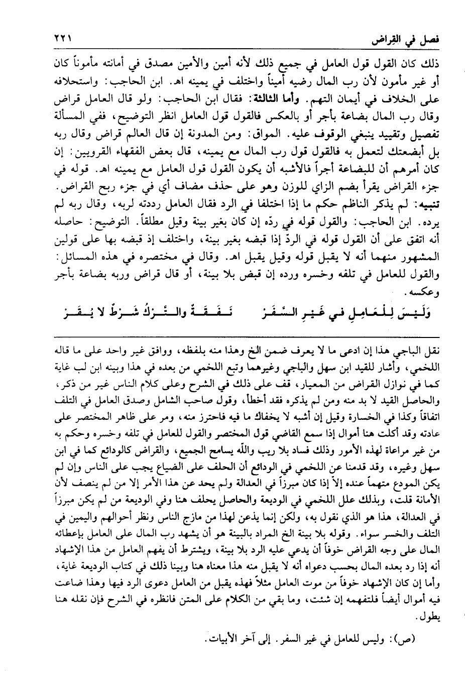 تنبيه لم يذكر الناظم حكم ما إذا اختلفا في الرد فقال العامل رددته لربه وقال ربه لم يرده ابن الحاجب والقول قوله في رده إن كان بغير بينة وقيل مطلقا التوضيح حاصله أنه اتفق على أن القول قوله في الرد إذا قبضه بغير بينة واختلف إذ قبضه بها على قولين المشهور منهما أنه لا يقبل قوله وقيل يقبل ا هـ