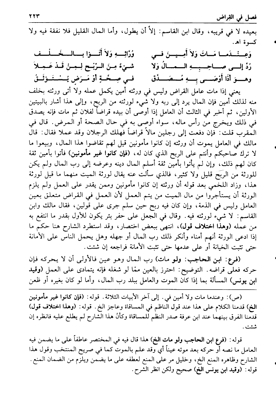 وعندما مات ولا أمين في وراثه ولا أتوا بالخلف رد إلى صاحبه المال ولا شيء من الربح لمن قد عملا وهو إذا أوصى به مصدق في صحة أو مرض يستوثق يعني إذا مات عامل القراض وليس في ورثته أمين يكمل عمله ولا أتى ورثته بخلف منه لذلك أمين فإن المال يرد إلى ربه ولا شيء لورثته من الربح وإلى هذا أشار بالبيتين الأولين ثم أخبر في الثالث أن العامل إذا أوصى أن بيده قراضا لفلان ثم مات فإنه يصدق في ذلك ويخرج من رأس ماله سواء أوصى به في حال الصحة أو المرض