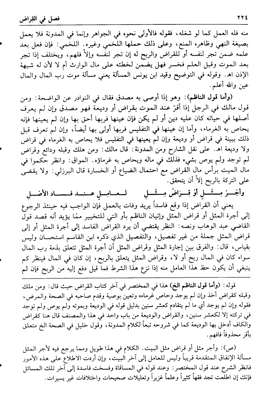 على نقل الشارح ومن المدونة قال مالك ومن هلك وقبله ودائع وقراض لم توجد ولم يوص بشيء فذلك في ماله ويحاص به غرماؤه المواق وانظر حكموا في مال الميت برأس مال القراض مع احتمال الضياع أو الخسارة قال البرزلي ولا يقضي على التركة بالربح إلا أن يتحقق وأجر مثل أو قراض مثل لعامل عند فساد الأصل يعني أن القراض إذا وقع فاسدا يريد وفات بالعمل فإن الواجب فيه حينئذ الرجوع إلى أجرة المثل أو قراض المثل وإتيان الناظم بأو التي للتخيير مما يؤيد أنه قصد قول القاضي عبد الوهاب ونصه النظر يقتضي أن يرد القراض الفاسد إلى أجرة المثل أو إلى قراض المثل جملة من غير تفصيل والتفصيل الذي ذكره ابن القاسم استحسان وليس بقياس قال والفرق بين إجارة المثل وقراض المثل أن أجرة المثل تتعلق بذمة رب المال سواء كان في المال ربح أو لا