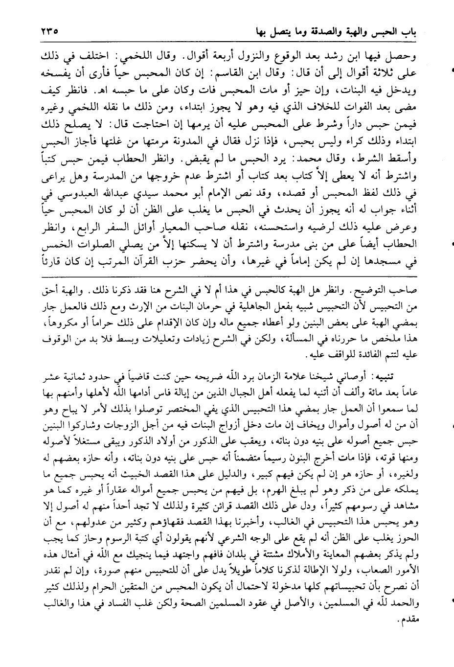فانظر كيف مضى بعد الفوات للخلاف الذي فيه وهو لا يجوز ابتداء ومن ذلك ما نقله اللخمي وغيره فيمن حبس دارا وشرط على المحبس عليه أن يرمها إن احتاجت قال لا يصلح ذلك ابتداء وذلك كراء وليس بحبس فإذا نزل فقال في المدونة مرمتها من غلتها فأجاز الحبس وأسقط الشرط وقال محمد يرد الحبس ما لم يقبض وانظر الحطاب فيمن حبس كتبا واشترط أنه لا يعطي إلا كتاب بعد كتاب أو اشترط عدم خروجها من المدرسة وهل يراعى في ذلك لفظ المحبس أو قصده وقد نص الإمام أبو محمد سيدي عبد الله العبدوسي في أثناء جواب له أنه يجوز أن يحدث في الحبس ما يغلب على الظن أن لو كان المحبس حيا وعرض عليه ذلك لرضيه واستحسنه نقله صاحب المعيار أوائل السفر الرابع وانظر الحطاب أيضا على من بنى مدرسة واشترط أن لا يسكنها إلا من يصلي الصلوات الخمس في مسجدها إن لم يكن إماما في غيرها وأن يحضر حزب القرآن المرتب إن كان قارئا