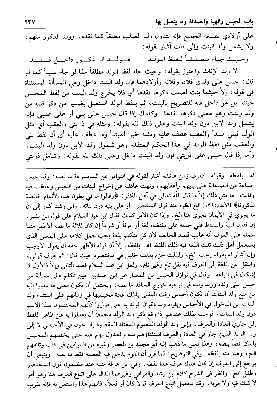 وإلى ذلك أشار بقوله وحيث جاء مطلقا لفظ الولد فولد الذكور داخل فقد لا ولد الإناث واحترز بقوله وحيث جاء لفظ الولد مطلقا مما لو جاء مقيدا كما لو قال حبس على ولدي فلان وفلانة وأولادهما فإن ولد البنت داخل