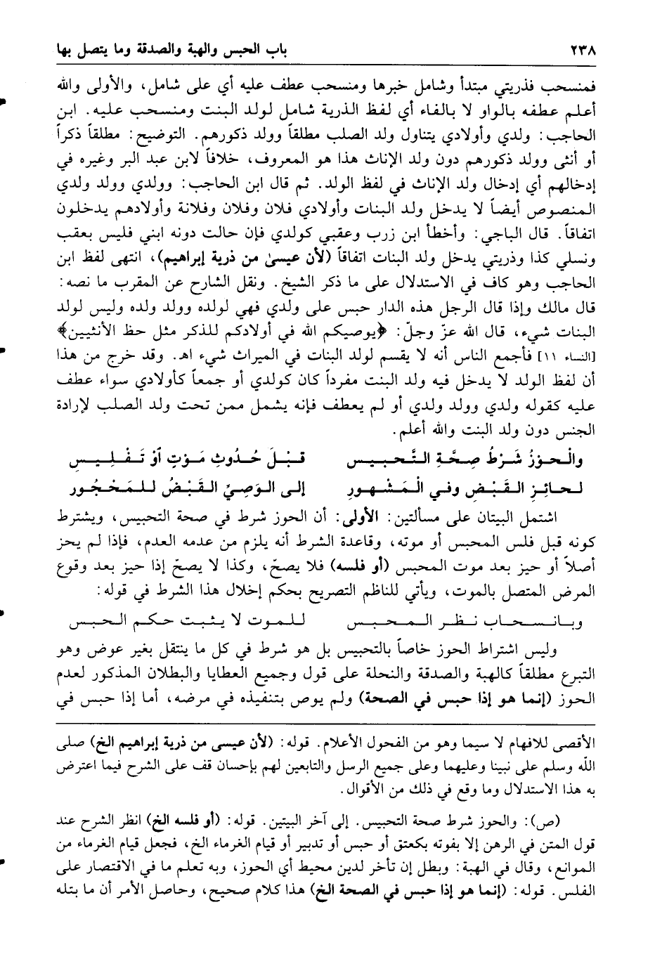 وقد خرج من هذا أن لفظ الولد لا يدخل فيه ولد البنت مفردا كان كولدي أو جمعا كأولادي سواء عطف عليه كقوله ولدي وولد ولدي أو لم يعطف فإنه يشمل ممن تحت ولد الصلب لإرادة الجنس دون ولد البنت والله أعلم والحوز شرط صحة التحبيس قبل حدوث موت أو تفليس لحائز القبض وفي المشهور إلى الوصي القبض للمحجور اشتمل البيتان على مسألتين الأولى أن الحوز شرط في صحة التحبيس ويشترط كونه قبل فلس المحبس أو موته وقاعدة الشرط أنه يلزم من عدمه العدم فإذا لم يحز أصلا أو حيز بعد موت المحبس أو فلسه فلا يصح وكذا لا يصح إذا حيز بعد وقوع المرض المتصل بالموت ويأتي للناظم التصريح بحكم إخلال هذا الشرط في قوله وبانسحاب نظر المحبس للموت لا يثبت حكم الحبس وليس اشتراط الحوز خاصا بالتحبيس بل هو شرط في كل ما ينتقل بغير عوض وهو التبرع مطلقا كالهبة والصدقة والنحلة على قول وجميع العطايا والبطلان المذكور لعدم الحوز إنما هو إذا حبس في الصحة ولم يوص بتنفيذه في مرضه أما إذا حبس في