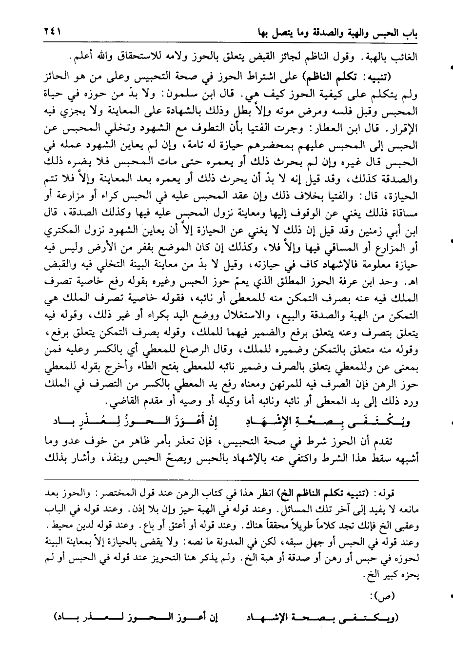 تنبيه تكلم الناظم على اشتراط الحوز في صحة التحبيس وعلى من هو الحائز ولم يتكلم على كيفية الحوز كيف هي قال ابن سلمون ولا بد من حوزه في حياة المحبس وقبل فلسه ومرض موته وإلا بطل وذلك بالشهادة على المعاينة ولا يجزي فيه الإقرار قال ابن العطار وجرت الفتيا بأن التطوف مع الشهود وتخلي المحبس عن الحبس إلى المحبس عليهم بمحضرهم حيازة له تامة وإن لم يعاين الشهود عمله في الحبس قال غيره وإن لم يحرث ذلك أو يعمره حتى مات المحبس فلا يضره ذلك والصدقة كذلك وقد قيل إنه لا بد أن يحرث ذلك أو يعمره بعد المعاينة وإلا فلا تتم الحيازة قال والفتيا بخلاف ذلك وإن عقد المحبس عليه في الحبس كراء أو مزارعة أو مساقاة فذلك يغني عن الوقوف إليها ومعاينة نزول المحبس عليه فيها وكذلك الصدقة قال ابن أبي زمنين وقد قيل إن ذلك لا يغني عن الحيازة إلا أن يعاين الشهود نزول المكتري أو المزارع أو المساقي فيها وإلا فلا وكذلك إن كان الموضع بقفر من الأرض وليس فيه حيازة معلومة فالإشهاد كاف في حيازته وقيل لا بد من معاينة البينة التخلي فيه والقبض ا هـ وحد ابن عرفة الحوز المطلق الذي يعم حوز الحبس وغيره بقوله رفع خاصية تصرف الملك فيه عنه بصرف التمكن منه للمعطي أو نائبه فقوله خاصية تصرف الملك هي التمكن من الهبة والصدقة والبيع والاستغلال ووضع اليد بكراء أو غير ذلك وقوله فيه يتعلق بتصرف وعنه يتعلق برفع والضمير فيهما للملك وقوله بصرف التمكن يتعلق برفع وقوله منه متعلق بالتمكن وضميره للملك وقال الرصاع للمعطي أي بالكسر وعليه فمن بمعنى عن وللمعطى يتعلق بالصرف وضمير نائبه للمعطى بفتح الطاء وأخرج بقوله للمعطي حوز الرهن فإن الصرف فيه للمرتهن ومعناه رفع يد المعطي بالكسر من التصرف في الملك