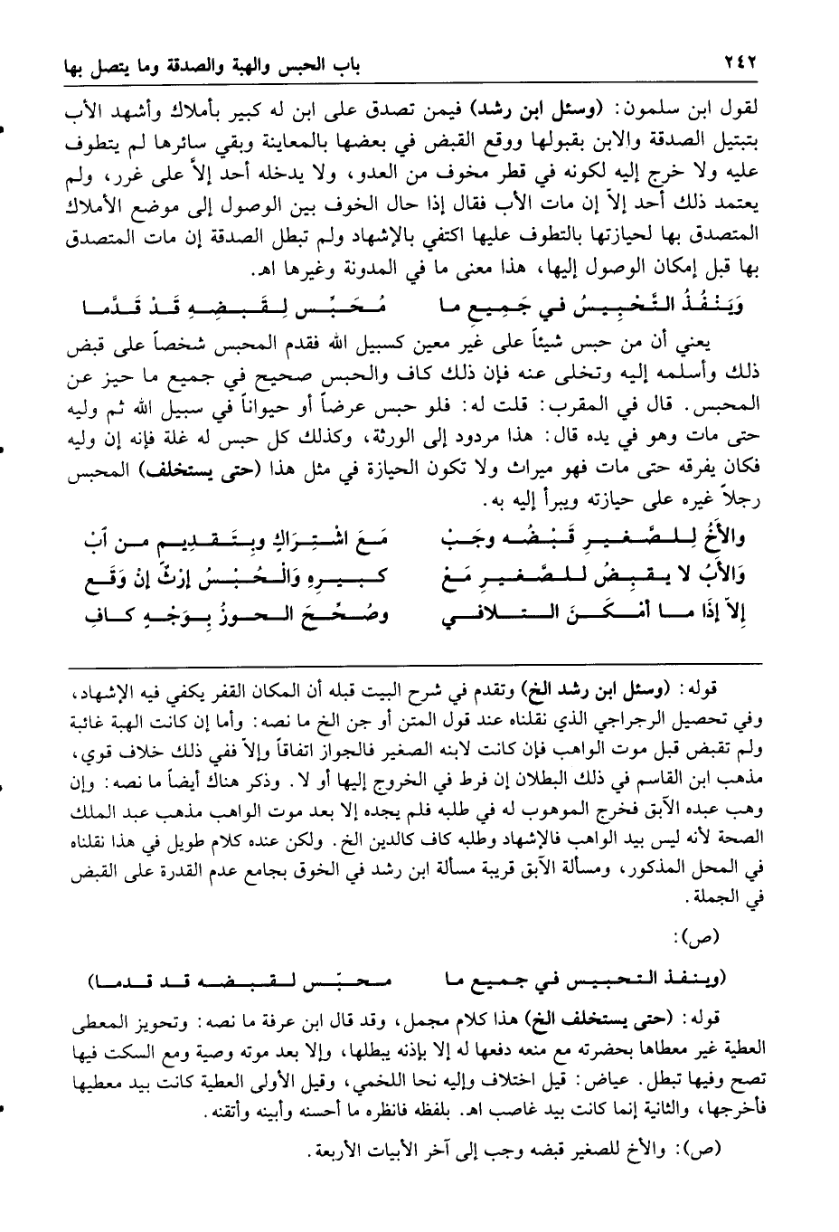 وينفذ التحبيس في جميع ما محبس لقبضه قد قدما يعني أن من حبس شيئا على غير معين كسبيل الله فقدم المحبس شخصا على قبض ذلك وأسلمه إليه وتخلى عنه فإن ذلك كاف والحبس صحيح في جميع ما حيز عن المحبس قال في المقرب قلت له فلو حبس عرضا أو حيوانا في سبيل الله ثم وليه حتى مات وهو في يده قال هذا مردود إلى الورثة وكذلك كل حبس له غلة فإنه إن وليه فكان يفرقه حتى مات فهو ميراث ولا تكون الحيازة في مثل هذا حتى يستخلف المحبس رجلا غيره على حيازته ويبرأ إليه به والأخ للصغير قبضه وجب مع اشتراك وبتقديم من أب والأب لا يقبض للصغير مع كبيره والحبس إرث إن وقع إلا إذا ما أمكن التلافي وصحح الحوز بوجه كاف