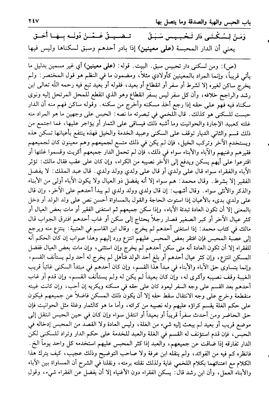 ومن لسكنى دار تحبيس سبق تضيق عمن دونه بها أحق يعني أن الدار المحبسة على معينين إذا بادر أحدهم وسبق لسكناها وليس فيها