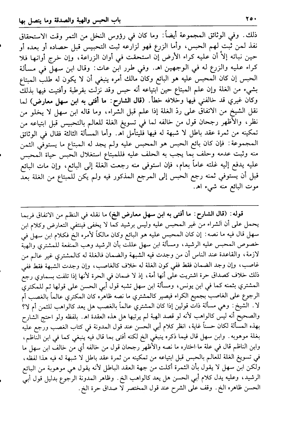 وفي طرر ابن عات وقال ابن سهل في مسألة الحبس إن كان المحبس عليه هو البائع وكان مالك أمره ينبغي أن لا يكون له طلب المبتاع بشيء من الغلة وإن علم المبتاع حين ابتياعه أنه حبس وقد نزلت بقرطبة وأفتيت فيها بذلك وكان غيري قد خالفني فيها وخلافه خطأ قال الشارح ما أفتى به ابن سهل معارض لما نقل الشيخ من الاتفاق على رد الغلة إذا علم قبل الشراء وما قاله ابن سهل لا يخلو من نظر والأظهر رجحان قول من خالفه لما في تسويغ الغلة للعالم بالتحبيس قبل ابتياعه من تمكينه من ثمرة عقد باطل لا شبهة له فيها فليتأمل ا هـ