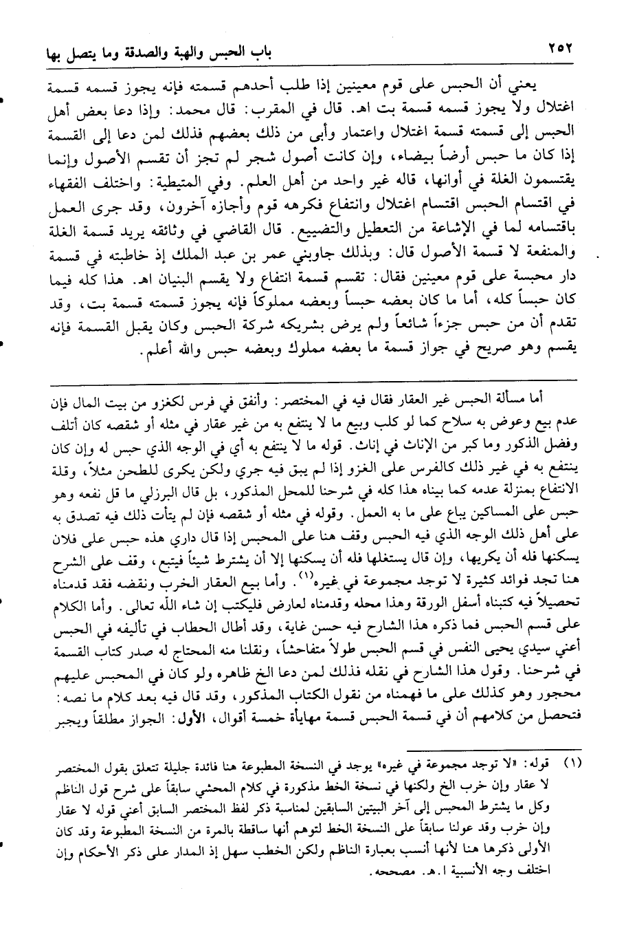 هذا كله فيما كان حبسا كله أما ما كان بعضه حبسا وبعضه مملوكا فإنه يجوز قسمته قسمة بت وقد تقدم أن من حبس جزءا شائعا ولم يرض بشريكه شركة الحبس وكان يقبل القسمة فإنه يقسم وهو صريح في جواز قسمة ما بعضه مملوك وبعضه حبس والله أعلم