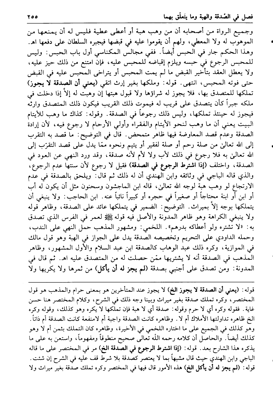 واختلف إذا اشترط الرجوع في الصدقة فقيل لا رجوع لأن سنتها عدم الرجوع والذي قاله الباجي في وثائقه وابن الهندي أن له ذلك ثم قال ويلحق بالصدقة في عدم الارتجاع لو وهب هبة لوجه الله تعالى قاله ابن الماجشون وسحنون مثل أن يكون له أب أو ابن أو ابنة محتاجا أو صغيرا في حجره أو كبيرا نائيا عنه ابن الحاجب ولا ينبغي أن يتملكها بوجه إلا بميراث التوضيح الضمير في يتملكها عائد على الصدقة وظاهر قوله ولا ينبغي الكراهة وهو ظاهر المدونة والأصل فيه قوله صلى الله عليه وسلم لعمر في الفرس الذي تصدق به لا تشتره ولو أعطاكه بدرهم اللخمي ومشهور المذهب حمل النهي على الندب وحمله الداودي على التحريم وتخصيصه الصدقة يدل على الجواز في الهبة وهو قول مالك في الموازية وكره ذلك عبد الوهاب كالصدقة ابن عبد السلام