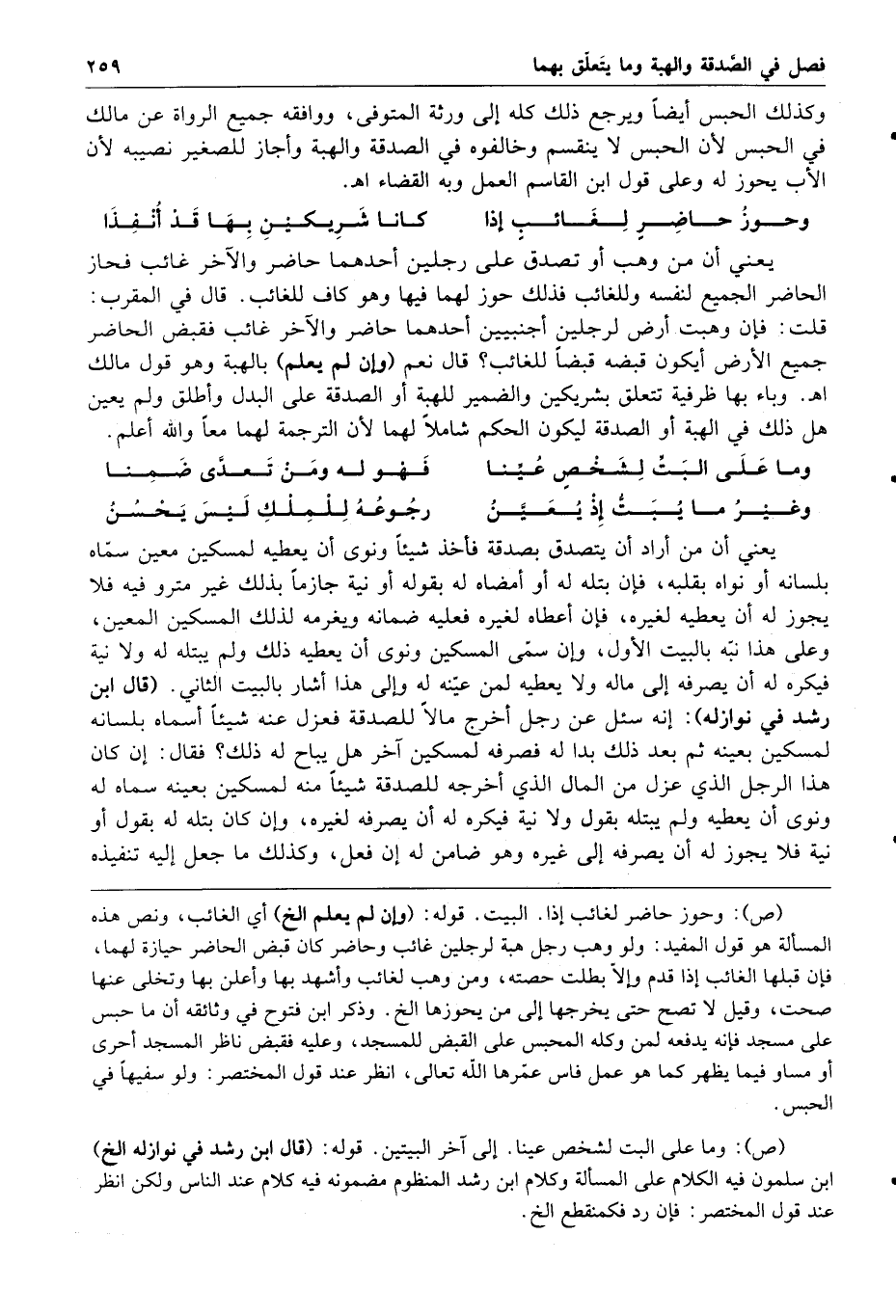 وكذلك الحبس أيضا ويرجع ذلك كله إلى ورثة المتوفى ووافقه جميع الرواة عن مالك في الحبس لأن الحبس لا ينقسم وخالفوه في الصدقة والهبة وأجاز للصغير نصيبه لأن الأب يحوز له وعلى قول ابن القاسم العمل وبه القضاء ا هـ وحوز حاضر لغائب إذا كانا شريكين بها قد أنفذا يعني أن من وهب أو تصدق على رجلين أحدهما حاضر والآخر غائب فحاز الحاضر الجميع لنفسه وللغائب فذلك حوز لهما فيها وهو كاف للغائب قال في المقرب قلت فإن وهبت أرض لرجلين أجنبيين أحدهما حاضر والآخر غائب فقبض الحاضر جميع الأرض أيكون قبضه قبضا للغائب قال نعم وإن لم يعلم بالهبة وهو قول مالك ا هـ