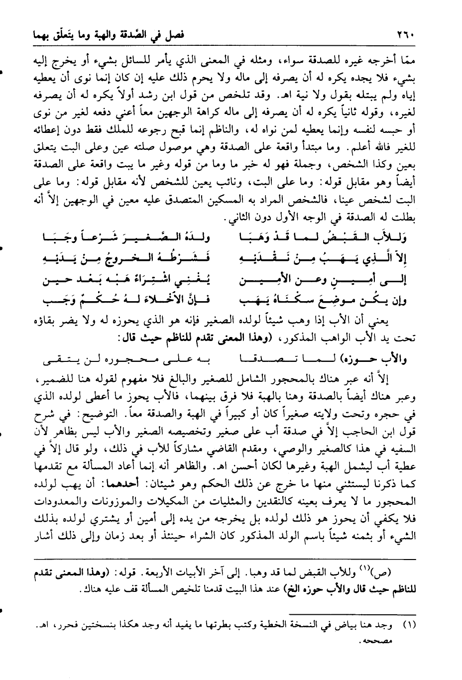 وقد تلخص من قول ابن رشد أولا يكره له أن يصرفه لغيره وقوله ثانيا يكره له أن يصرفه إلى ماله كراهة الوجهين معا أعني دفعه لغير من نوى أو حبسه لنفسه وإنما يعطيه لمن نواه له والناظم إنما قبح رجوعه للملك فقط دون إعطائه للغير فالله أعلم